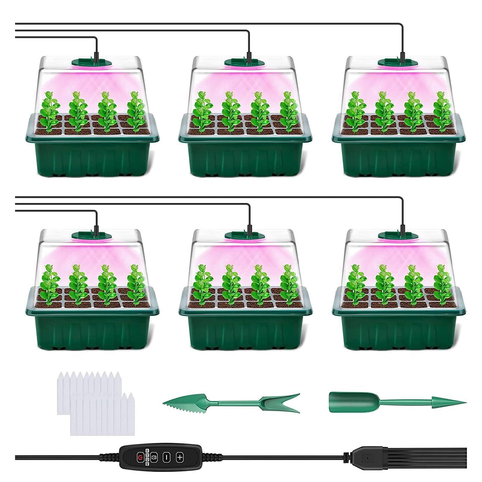 【数量限定】育苗ポット 育苗トレイ 6個セット 72穴 植物育成ライト付き 育苗箱 種まきポット トレー 高さ16cm 透明カバー 発芽育苗器 発芽•育苗セット 育苗ボックス 種子トレイ 苗箱 ライト 移植ツール2個 植物ラベル20枚付き 種まきハウス 湿度・温度管理 通気性 耐久性 園芸 植物栽培 園芸/植栽/庭園