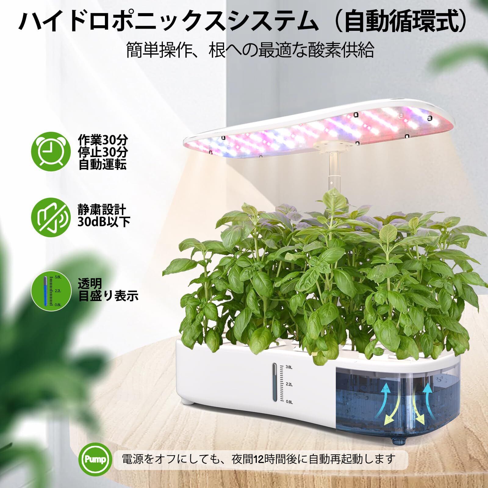 自動水循環システムで簡単管理: 超静音の自動水循環システムを搭載した水耕栽培キット。4リットルの大容量タンクで植物に常に十分な水分を供給。30分ごとに作動するポンプが酸素を供給し、根の成長をサポート。観察窓から水位と根の状態を簡単に確認可能。