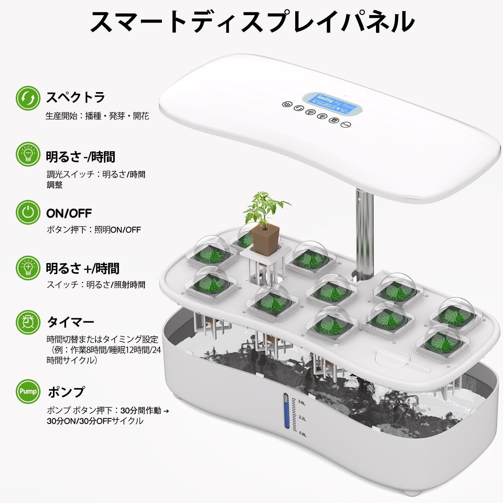 【特価セール】水耕栽培キット、LED植物成長ライトとスマートディスプレイを搭載し、簡単に操作できます。自動水循環システムとタイマー機能により、3つの栽培モードが提供され、12種類の植物を栽培できます。栽培キットの高さと照明明るさは、植物の成長段階に応じて調整可能。これにより、植物に最適な生育環境を提供します (ホワイト)