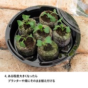 付属のジフィーセブンにタネをまいて、芽が出たらお好きな場所にそのまま植え付けてください。別売りのジフィーセブン(42mm)を購入すれば容器は繰り返しお使いいただけます。付属の活力剤はお好きな場所に植え付けた後にお使いください。