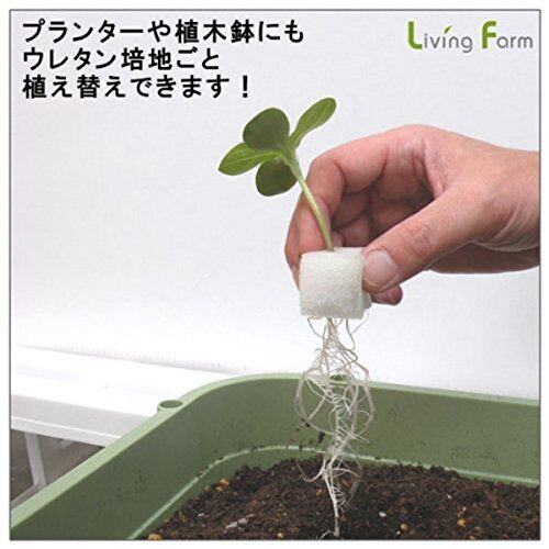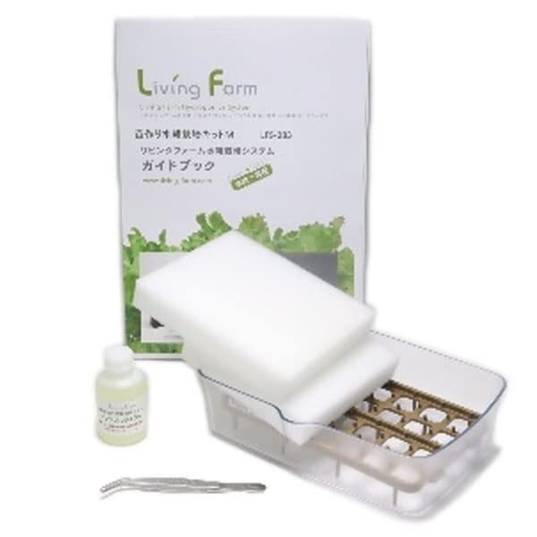 効率よく種子から苗を育てる「リビングファーム式水耕育苗」の育苗容器・トレイ、ウレタンスポンジ培地、液体肥料のお得な5点セットです。