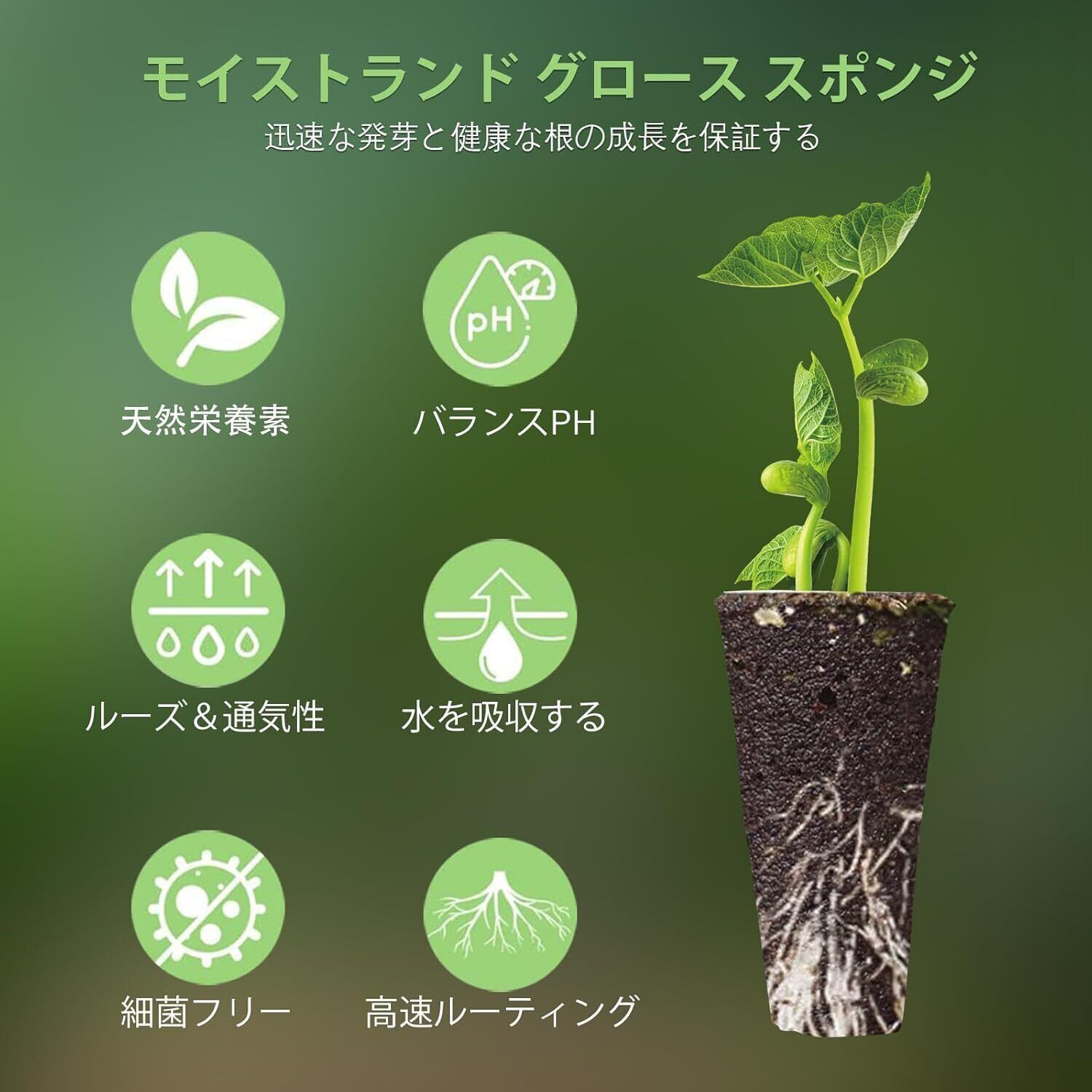 高品質な栽培スポンジ:環境に優しい生分解性素材を使用し、形状が整い、pH値がバランスされています。乾燥しており、高い吸水能力を持ち、種子の発芽に最適な環境を提供します。