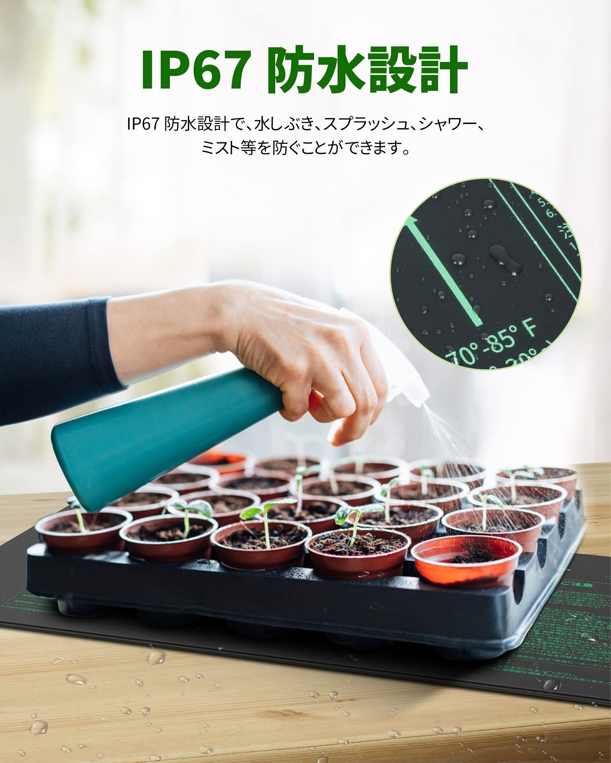 【優れ耐久性&使いやすい】熱伝導フィルムを包む柔軟なPVCの多重層でできており、外側の層は内部の発熱体を保護するために密閉されていますので、耐摩耗性と耐久性に優れています。 IP67 防水設計で、表面は掃除が簡単で安全にこすり洗いできます。苗付け用ヒートマットを平らに置き、プラグをソケットに差し込み、苗スタートトレイをヒートマットに置いて電源を入れるだけで加熱が始まります。種まきには欠かせません。