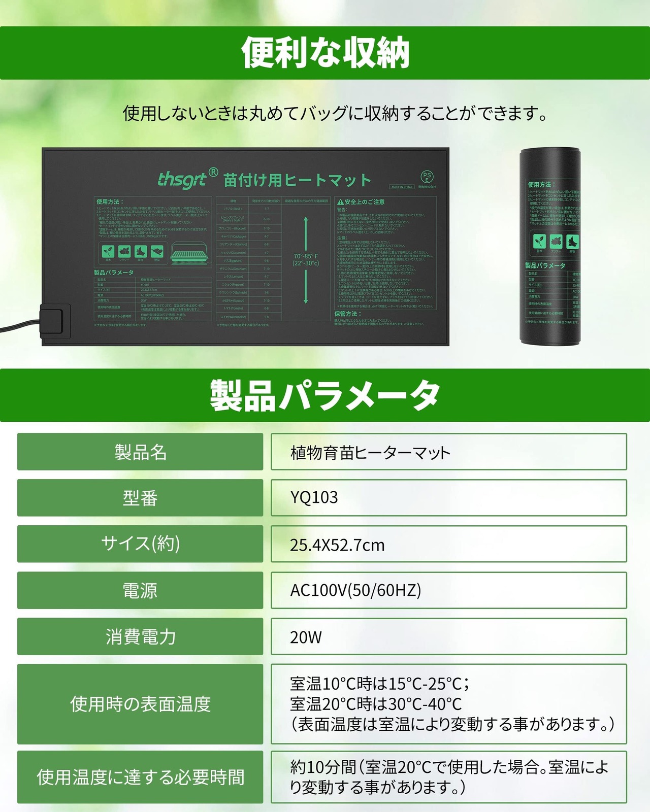 【便利な収納&電気代を節約する】この10インチ x 20.75インチのヒーティングマットは軽量でコンパクト。使用しないときは丸めて収納できます。どこに保管しても場所をとりません。限られた範囲で保温するだけで、暖房費をかけずに効率的な栽培が可能です。