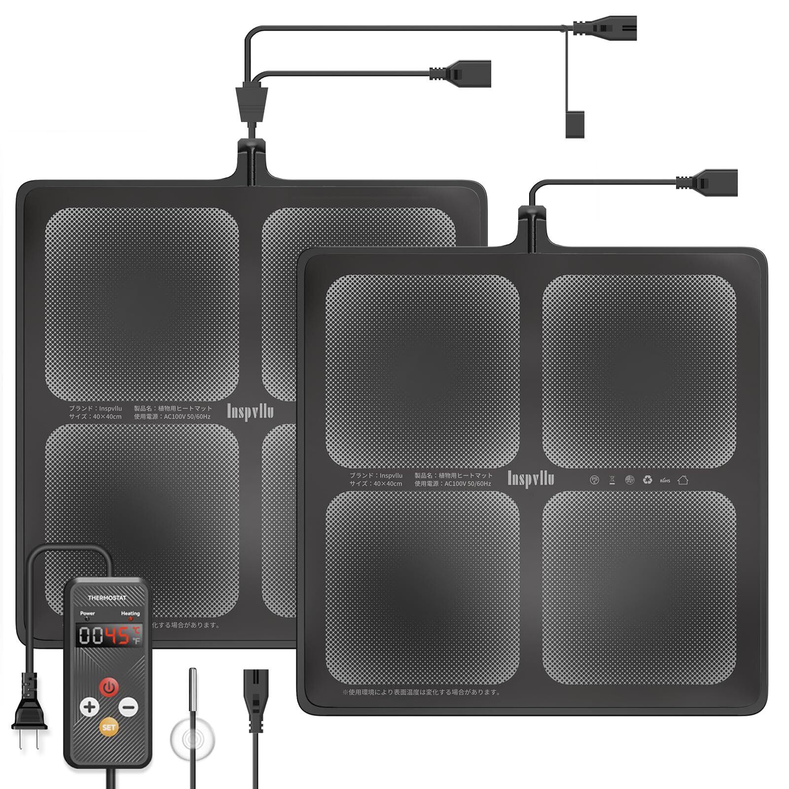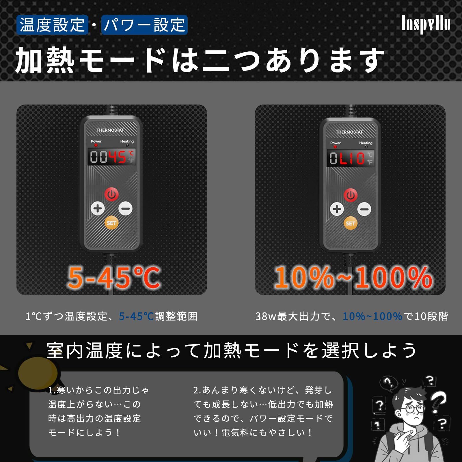 植物 ヒートマット ヒーターマット 40×40cm 園芸用 ヒーター サーモスタット付き デジタル表示 5-45℃ 1度ずつ調節 パワー調節 1-24hタイマー 温度センサー付 恒温 ip67 防水 過熱保護 育苗器 室内用 観葉植物や多肉植物などの植物保温(76W,2枚セット/2in1,ブラック)