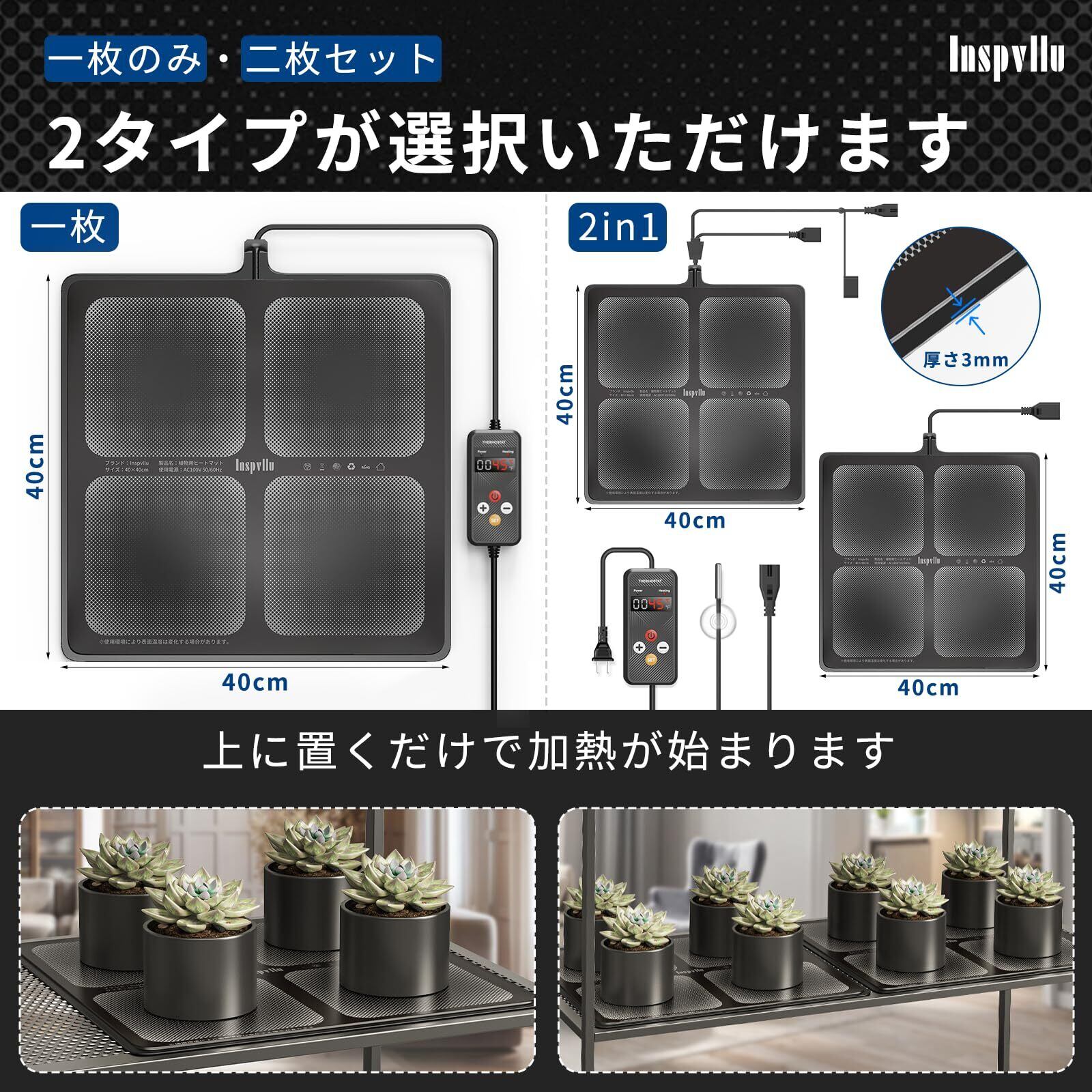 【新着商品】植物 ヒートマット ヒーターマット 40×40cm 園芸用 ヒーター サーモスタット付き デジタル表示 5-45℃ 1度ずつ調節 パワー調節 1-24hタイマー 温度センサー付 恒温 ip67 防水 過熱保護 育苗器 室内用 観葉植物や多肉植物などの植物保温(76W,2枚セット/2in1,ブラック)