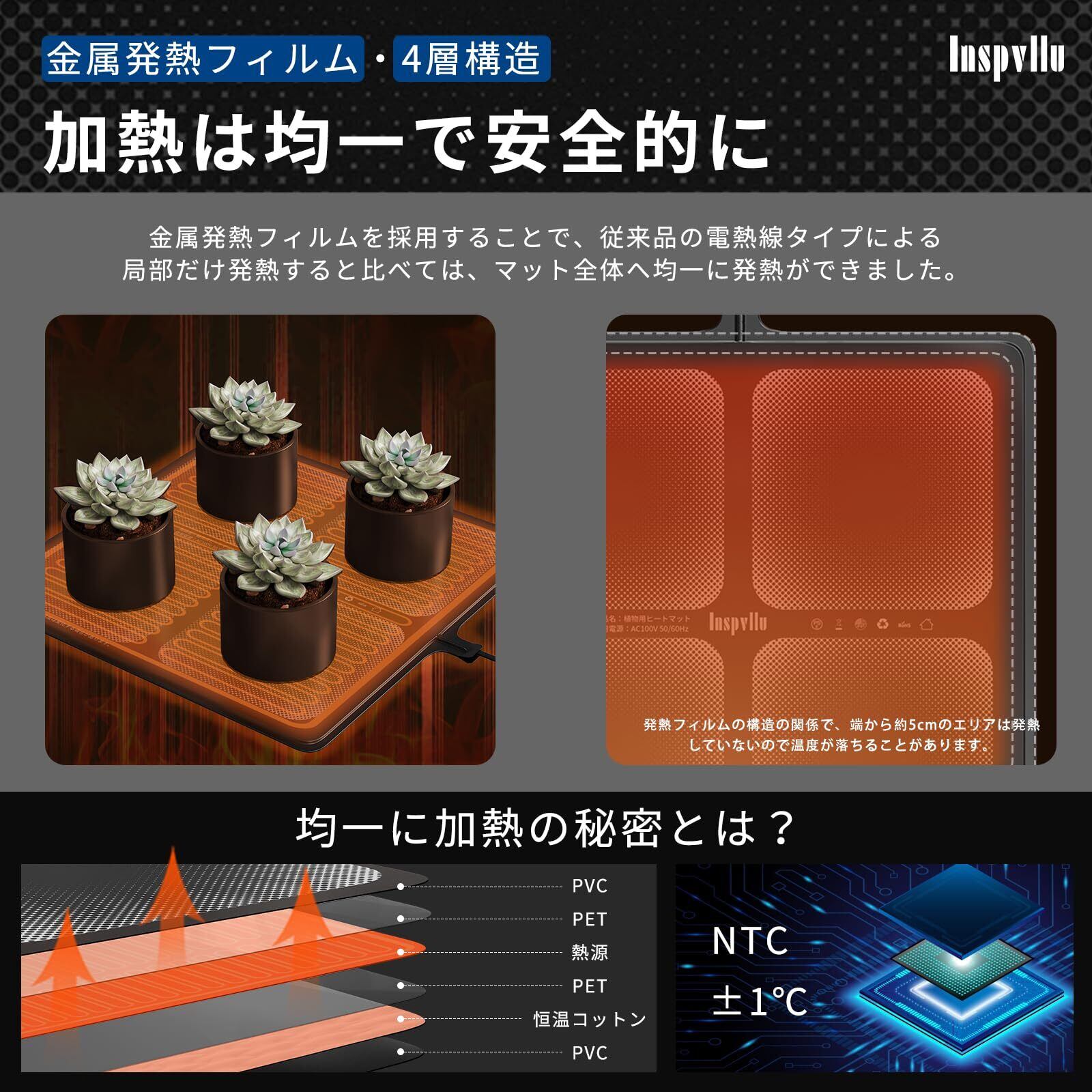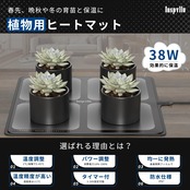 【重要なことです】最初に届ける時はかなりゴワゴワになっていますが、電源入れて少し時間加熱させていて、表面のPVCは柔らかくなり、本来の平った様子に戻ります。【植物の保温や発芽、育苗に効果的に】この植物用ヒーターマットの使い道は 1.鉢やプランターの植物の冬の寒さ・低温対策 2.早春や晩秋の種まき後の育苗のための保温 が中心です。冬は、室内でも夜間など暖房しなければ室温は10℃を下回ることがあります。観葉植物、ラン、サボテンなどには寒すぎるかもしれません。また、春先や晩秋に種まきをして育苗するには、室内でも温度が低く、発芽しても成長しないことがあります。そんな時は、植物用ヒーターマットをおすすめします。