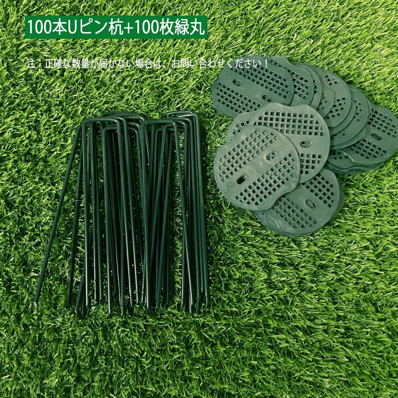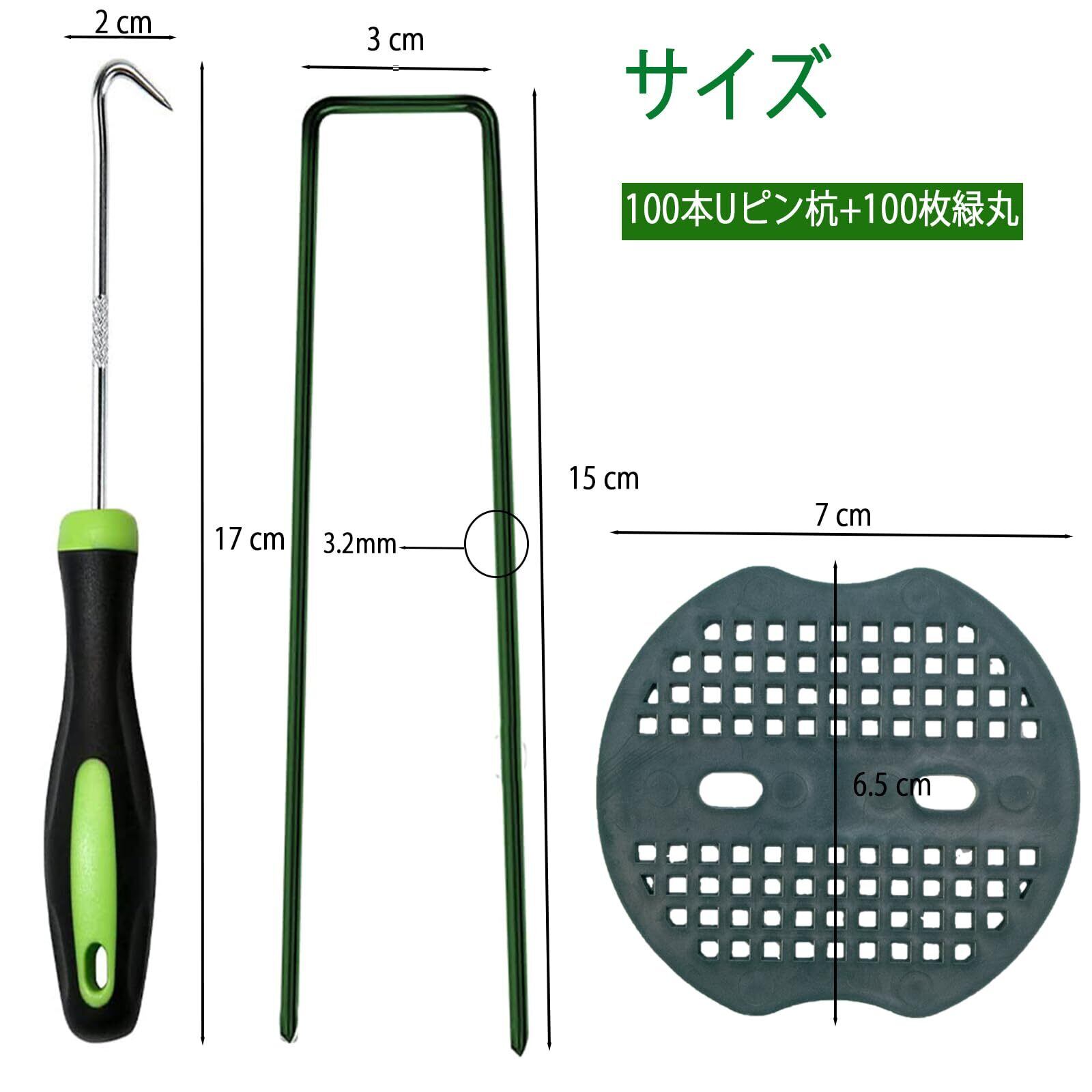 【パッケージ内容】 Uピン杭のサイズは15cmx3cmで、直径は約3.2mm、数量は100本。緑丸100本と抜きフック1本も含まれており、お客様にとって最適な製品内容です。