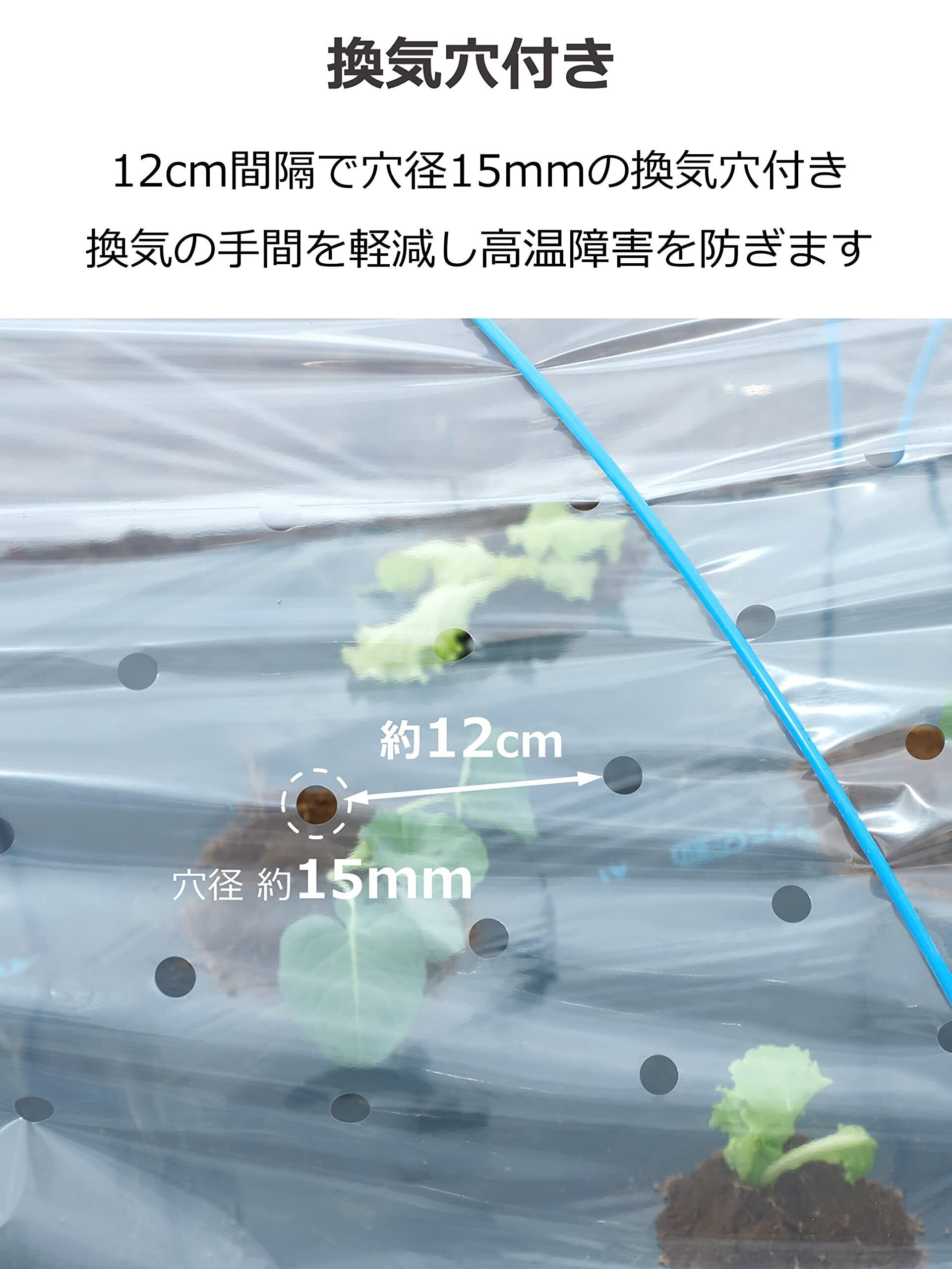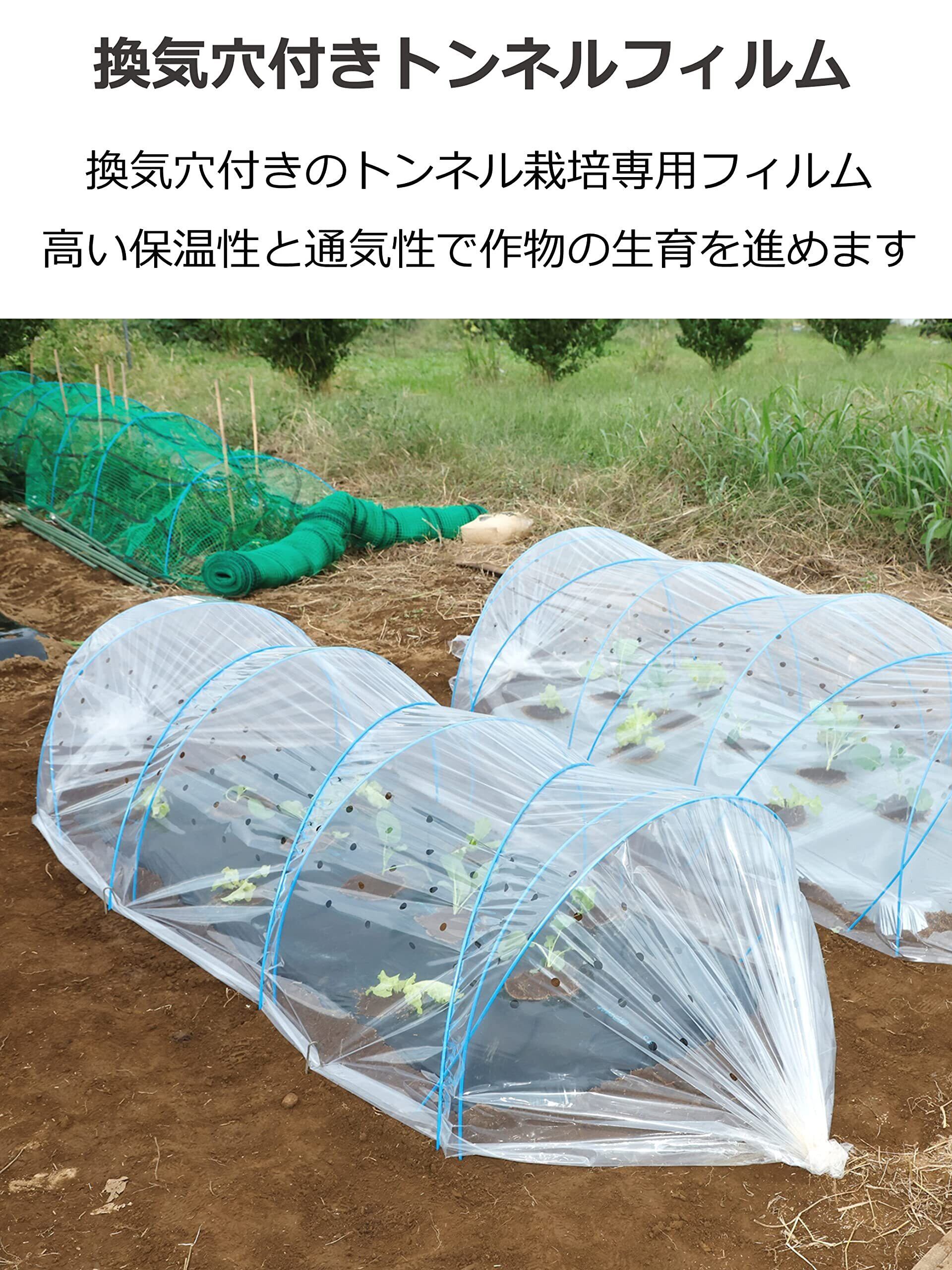 ●保温性と通気性を兼ね備えた換気穴付きのトンネル栽培専用フィルムです。