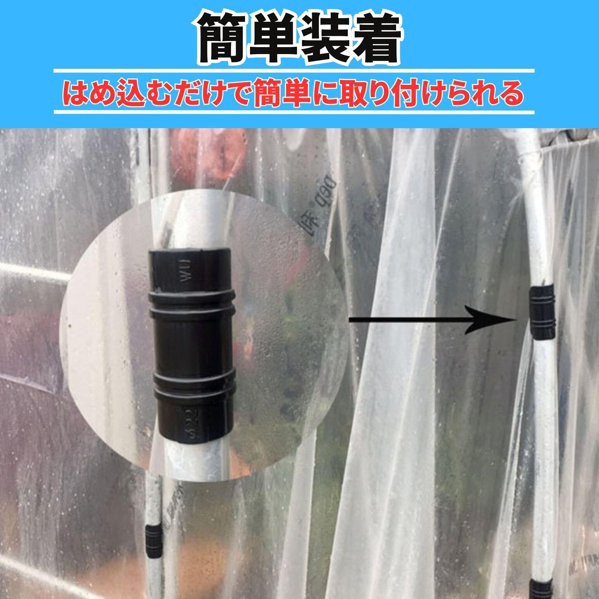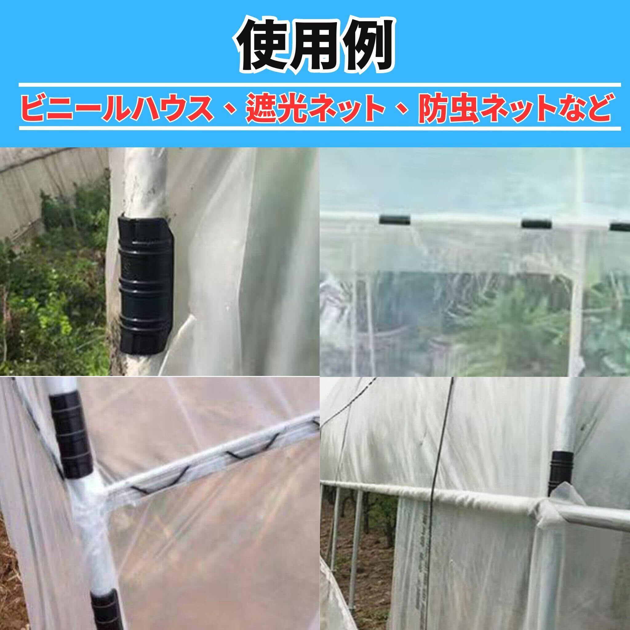 (幅広い用途での利用)ビニールハウス、温室、家庭菜園のビニールトンネルなど、幅広い用途で活躍します。雨や強風にも耐えられる頑丈な作りで、農業やガーデニングのシーンで重宝するアイテムです。遮光ネットや防虫ネットの固定にも最適です。