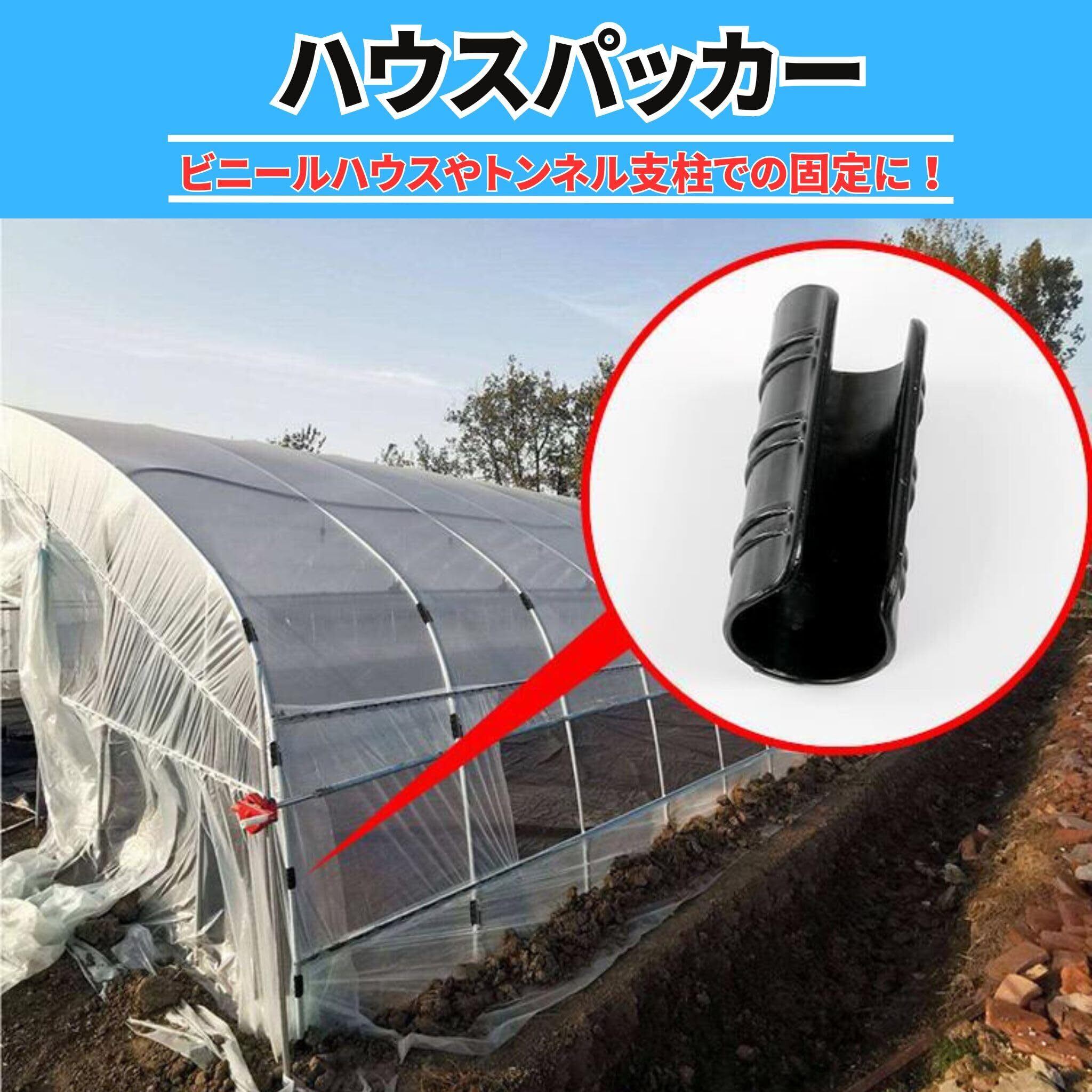 (商品の特徴と用途の紹介)20個入りのハウスパッカーは、農業用ビニールハウスや家庭菜園のビニールトンネルにフィルムやネット類をしっかりと支柱に留める便利なアイテムです。遮光ネット、防虫ネット、日除けネットなどの固定にも使用できます。