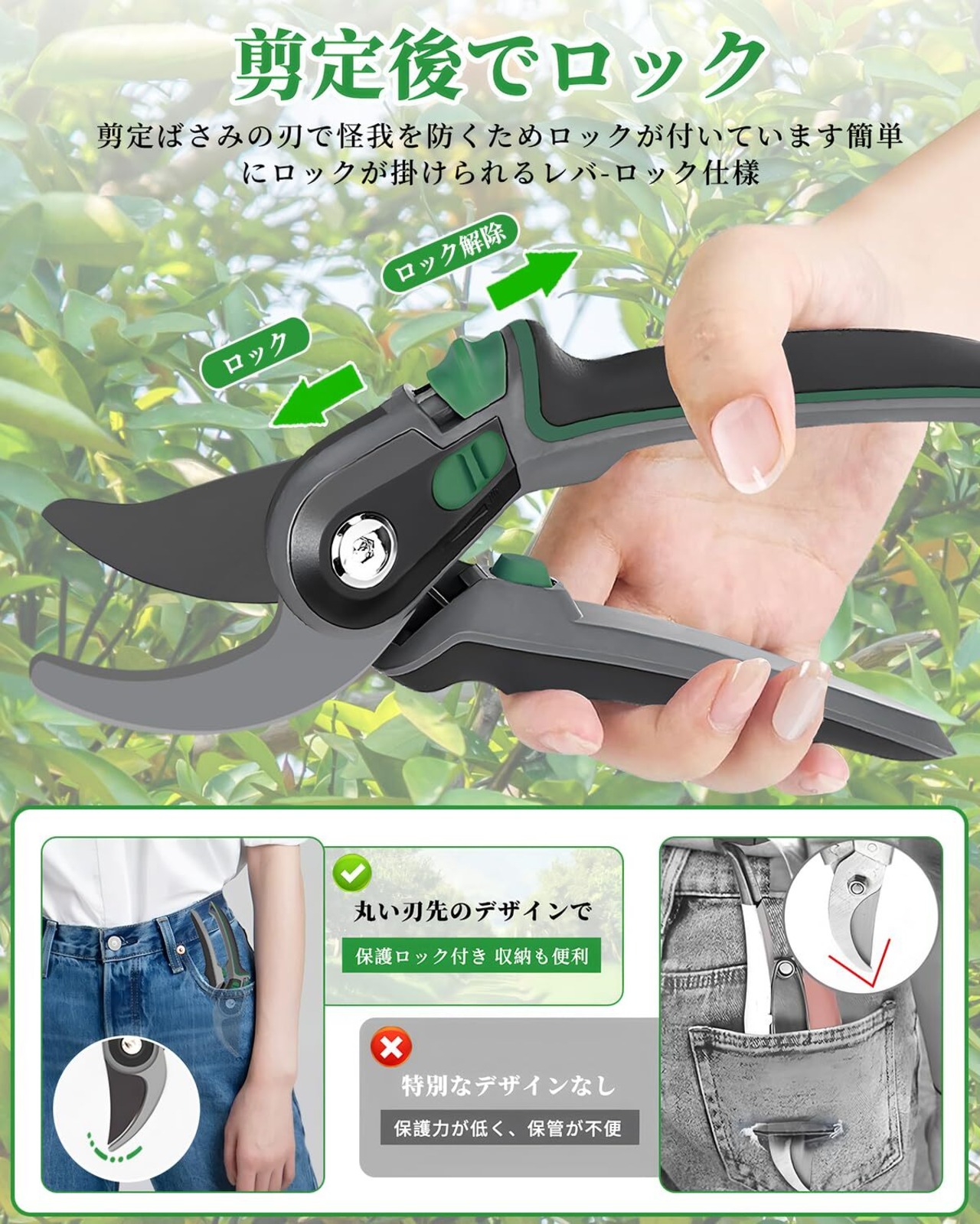 【安全ロック付き】当社の庭鋏は内蔵スプリング設計を採用しており、スプリングの脱落や剪断破壊の発生を効果的に防ぎます。安全ロックは、使用していないときにハサミが誤って開くのを効果的に防ぎ、安全を保護します。ロック設計は、怪我を避けるためにはさみを保管するのにも役立ちます。