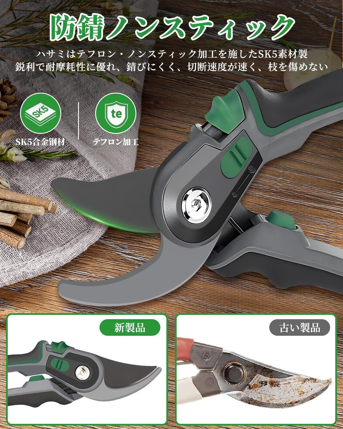 【錆びにくく切れ味長持ち】 庭木や果樹の剪定に大変便利な剪定鋏です。刃は剪定鋏の重要な部分で、硬度と靭性を兼ね備えたSK85(SK5)鋼を使用しています。ブレードは高周波焼入れにより、硬度と靭性を兼ね備えています。 ハンドルには少量のアルミニウム合金を使用し、耐久性を確保。チタン・メッキにより、魅力的で錆びにくく、お手入れのしやすい仕上がりになっています。