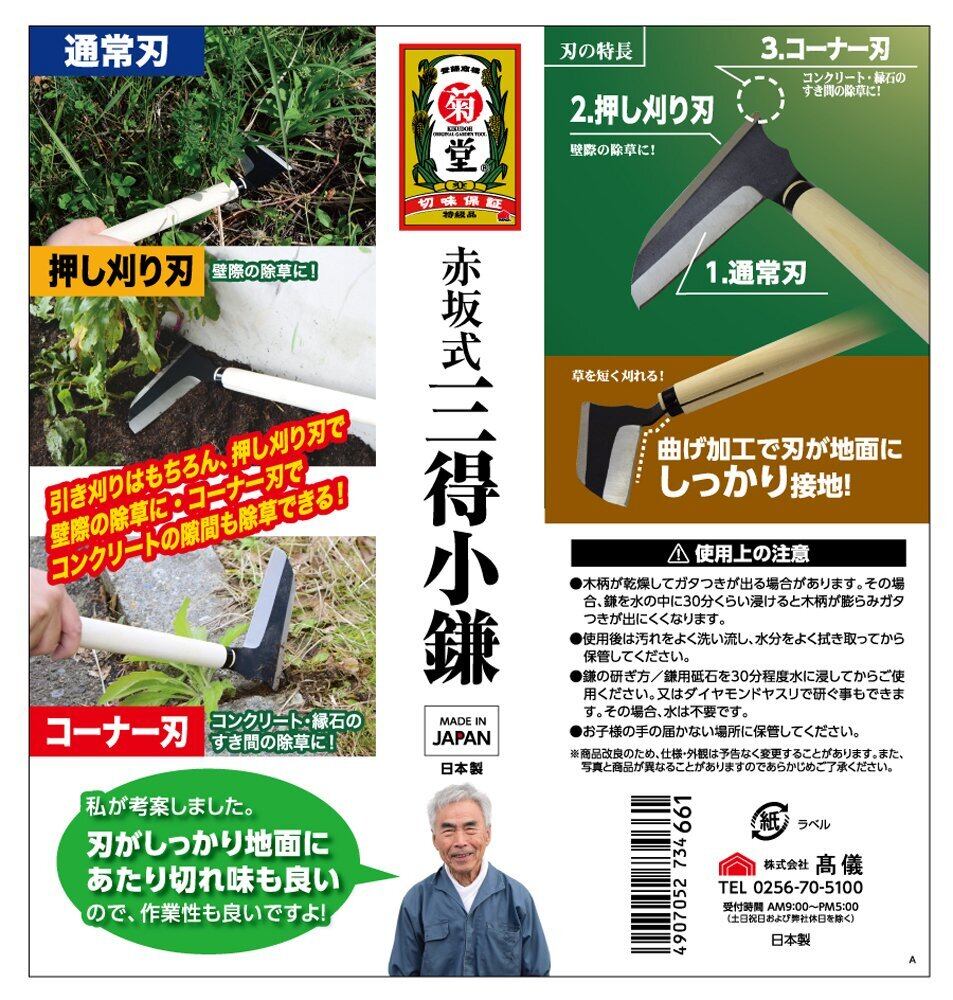 【数量限定】高儀(Takagi) 赤坂式三得小鎌 菊堂 豊稔 押しても引いても刈れる 日本製 コンクリートのすき間の除草に 125mm 4907052734661