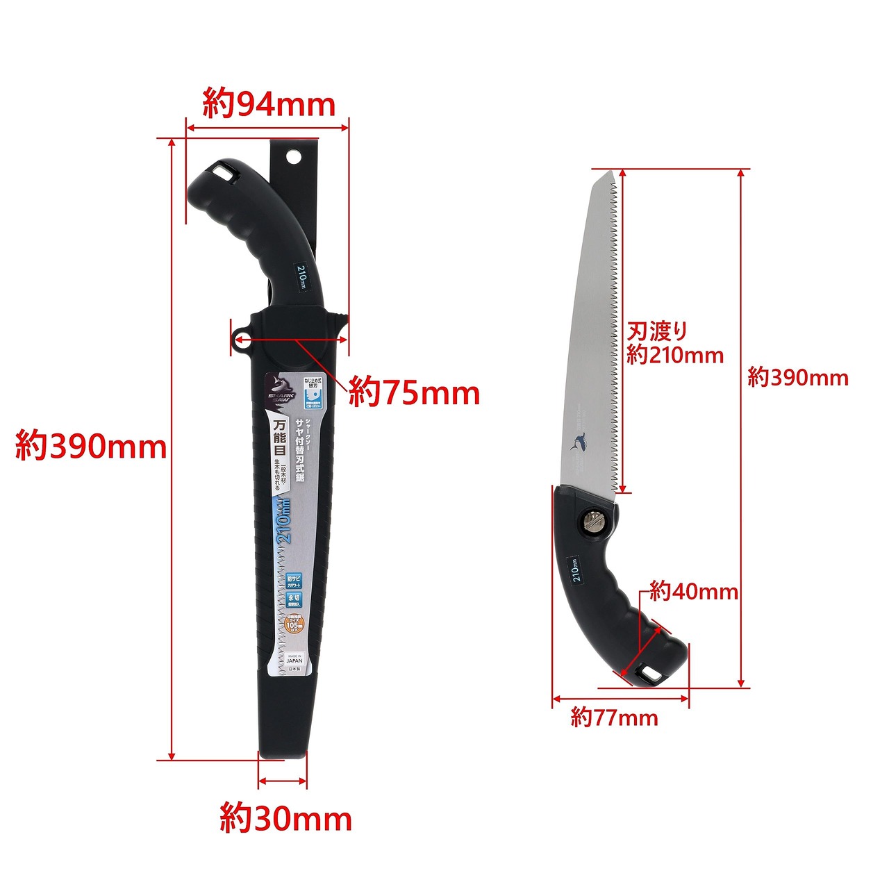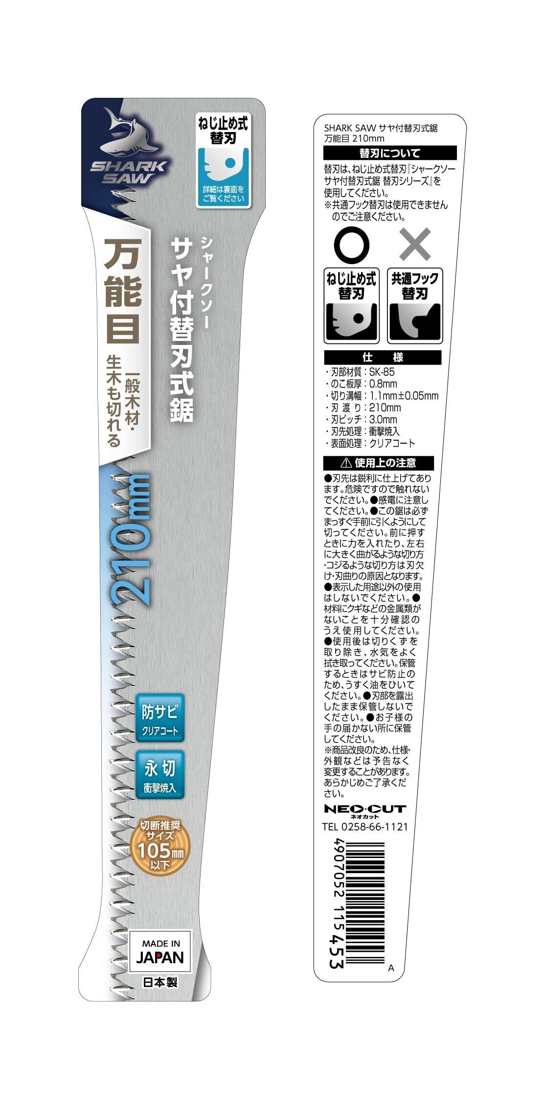 のこ板厚:0.8mm、切り溝幅:1.1mm±0.05mm、刃渡り:210mm、刃ピッチ:3.0mm