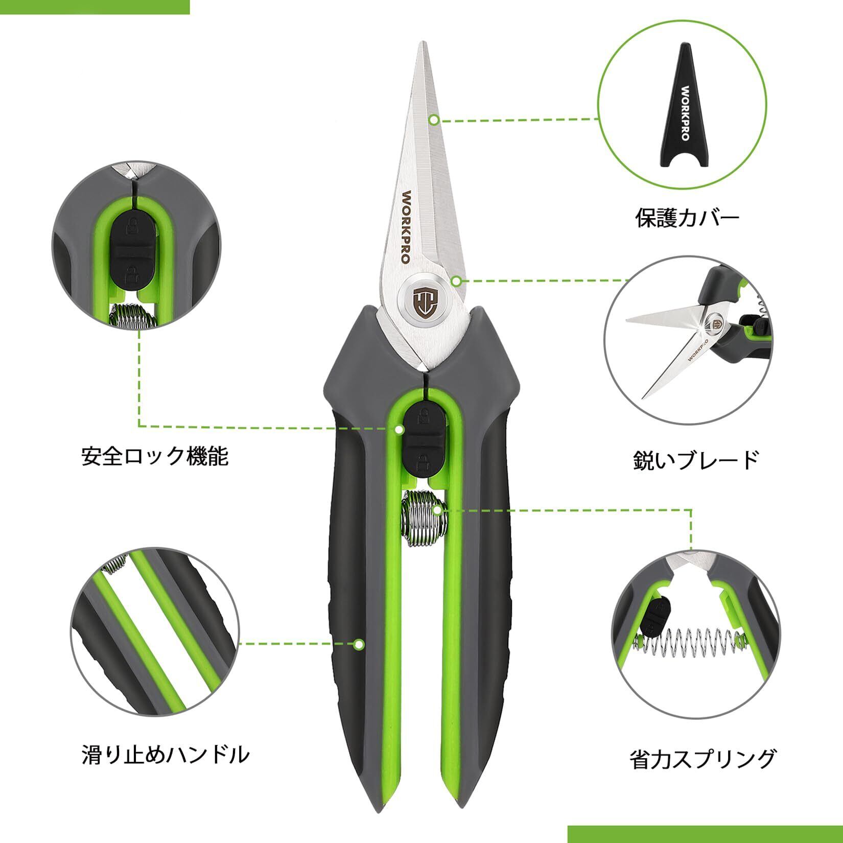 WORKPRO 剪定ばさみ 園芸ばさみ 鋏 剪定鋏 園芸鋏 ハサミ サクサク切れる 握りやすい 安全ロック付き 生け花 庭木 枝切り 果樹 盆栽 庭園 剪定 作業 はさみ グリーン&ブラック