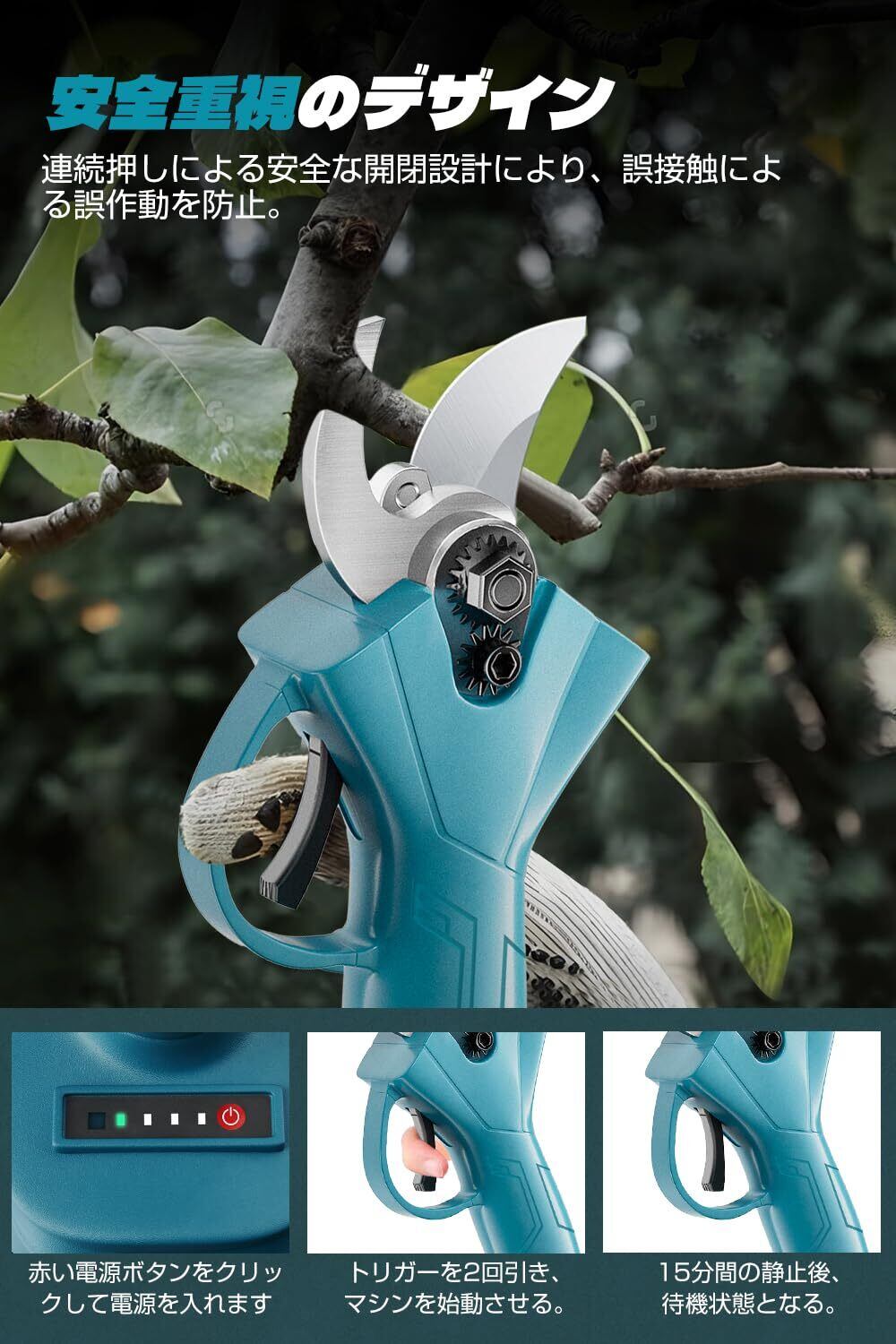 【軽量化と安全性を両立】本電動枝切り鋏では、手首や腕への負担を軽減するため、本体重量わずか854gの超軽量設計を実現します。長時間の剪定作業でも、電動剪定ばさみならリラックスした快適な操作感を維持できます。小型でコンパクトなボディ設計により、高所や狭い場所でもフレキシブルに作業できます。誤ってスイッチを入れてしまう可能性を減らすため、この枝切りバサミはトリガーを2回引くことで作動するセーフティロックを採用しており、より 安心・安全に作業を行うことができます。