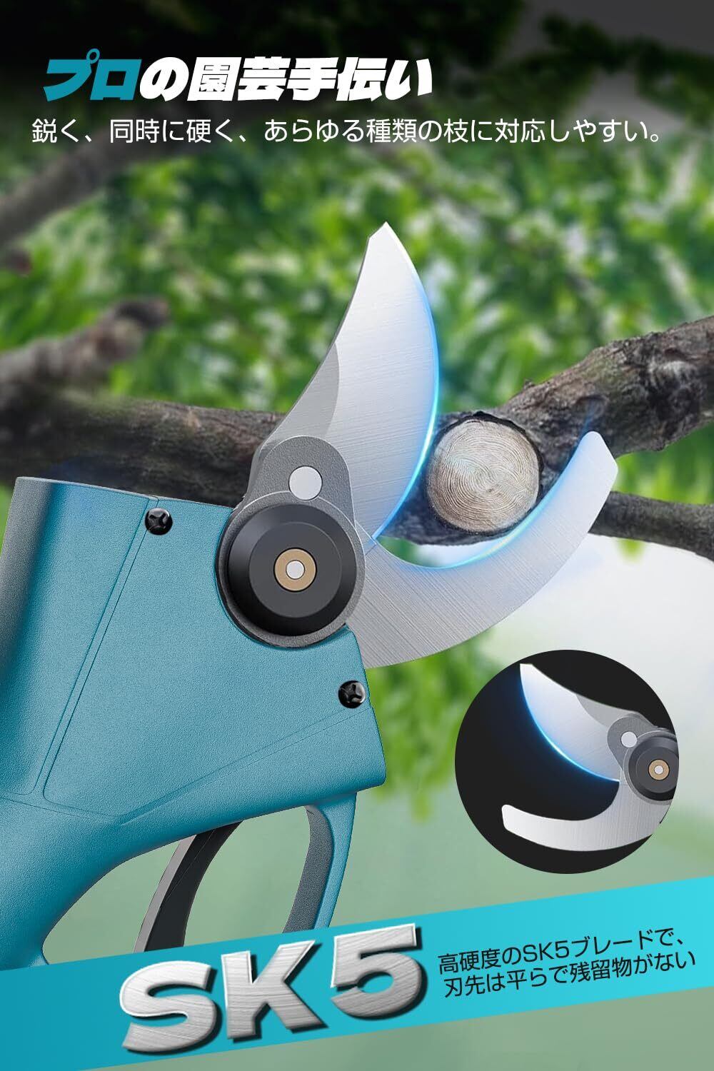 【ブラシレスモーターとSK5高硬度ブレードの強力なセット】この電動ハサミはブラシレスモーターを採用し、強力なパワーを発揮します。モーターには過電流保護と過電流保護機能があり、高効率で安全な作業を提供します。 また、この電動剪定バサミは工業用SK5ステンレス鋼を採用し、切れ味はもちろん、耐摩耗性、耐腐食性にも優れています。 長期間の使用でも切れ味は新品同様で、交換頻度を減らし、耐用年数を延ばすことができます。2個の強力な18Vバッテリーが、電動枝切りの長寿命に必要な電力を供給し、ワイヤーを不要にして作業効率を飛躍的に高めます。