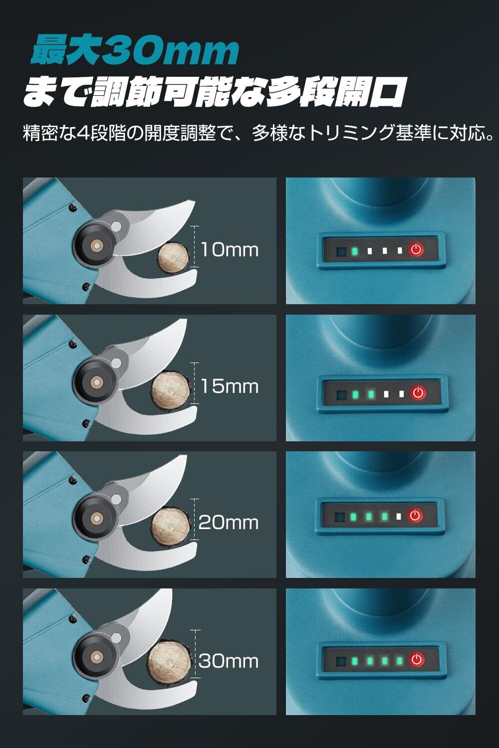 【最大30 mmまでの4段階開口】究極の剪定結果を求める園芸愛好家のために設計されたこの電動ハサミは、洗練された4段階開度調整システムを搭載し、細い新梢から太い枝まで、幅広い枝の切断ニーズに的確に対応します。 また、直径30mmまでの太い枝も難なく切断できる高強度切断機構を搭載し、切り残しのないきれいな切断を実現します。 細かい盆栽の剪定から、大規模な果樹園の手入れまで、この枝切りバサミを使えば、プロの剪定技術が簡単に発揮できます。
