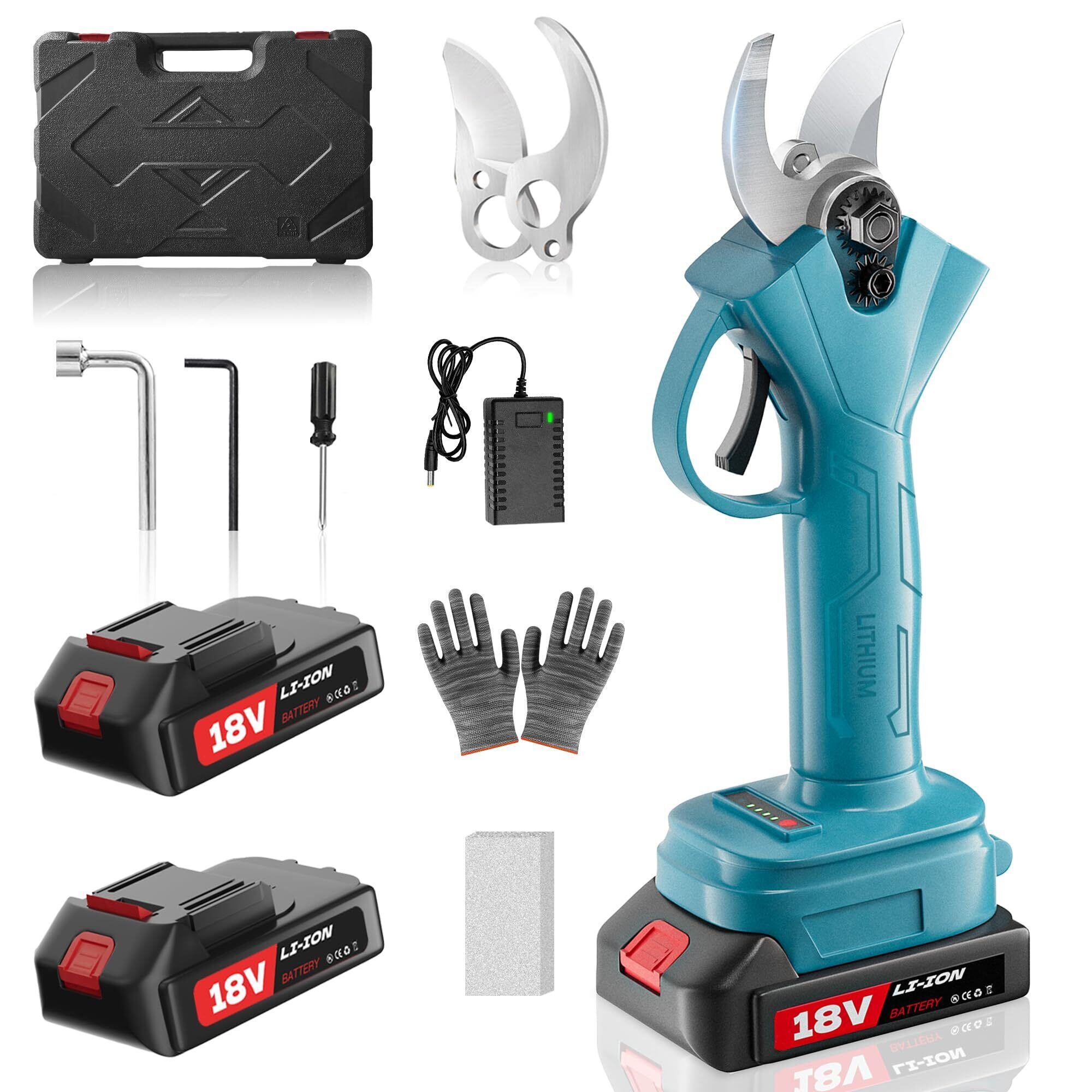 【様々な付属品】 この電動枝切りを購入すると、様々な付属品の構成を取得します。 電動ハサミの本体、2つの充電式バッテリー、充電器、ツールキット、砥石、手袋、替刃セット、収納ケースと日本語取扱説明書を含まれています。 追加で購入することなくすべての付属品が揃っているので、使用中に付属品が足りなくなる心配がありません。 また、収納ケースは工具をすっきりと整理でき、取り出しやすく、持ち運びにも便利です。【ご注意:本製品には潤滑油とベルトは含まれておりませんので、別途お買い求めください。】