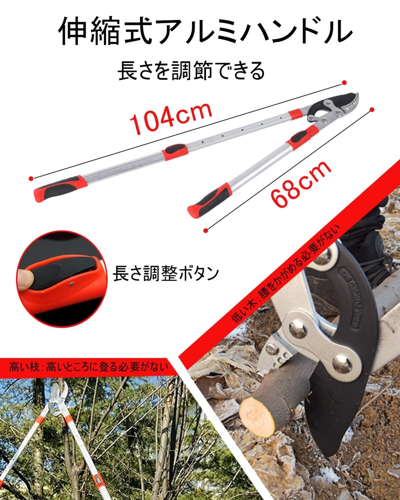 「長さ調節可能な5段階ハンドル」枝切りはさみのハンドルの長さは調節可能で、ボタンを押すだけで、簡単に調節することができます。剪定バサミのハンドルは5段階あり、最短で68cm、最長で104cmと、枝の高さに合わせてハンドルの長さを自由に調節できるので、高い枝ははしごを使わずに、低い枝は腰をかがめずに簡単に剪定することができます。
