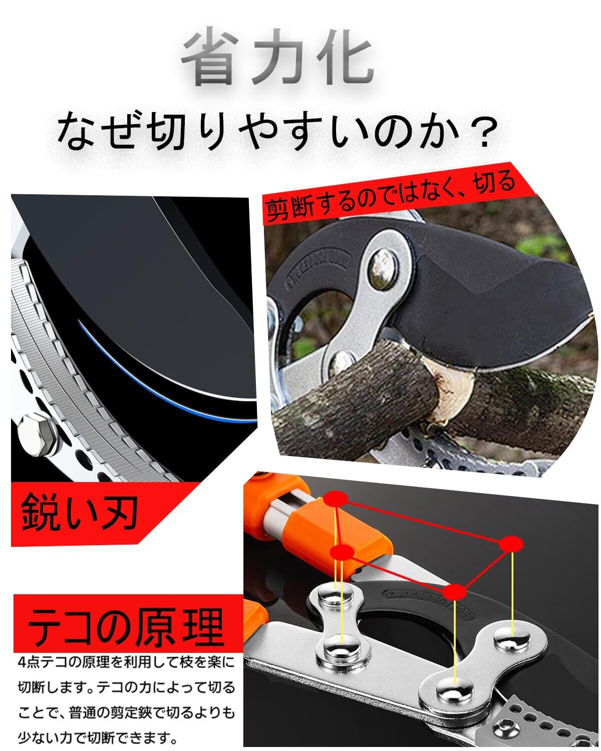 「スムーズな切れ味」せんていばさみの刃は高硬度SK5高級炭素刃物工具鋼を使用し、刃先は硬く鋭くなるように特殊加工されています。 剪定鋏で切った枝の切断面はとても滑らかです。樹木を傷つけずに枝を剪定します。果樹、街路樹や庭園植物にとって非常に重要なことです。