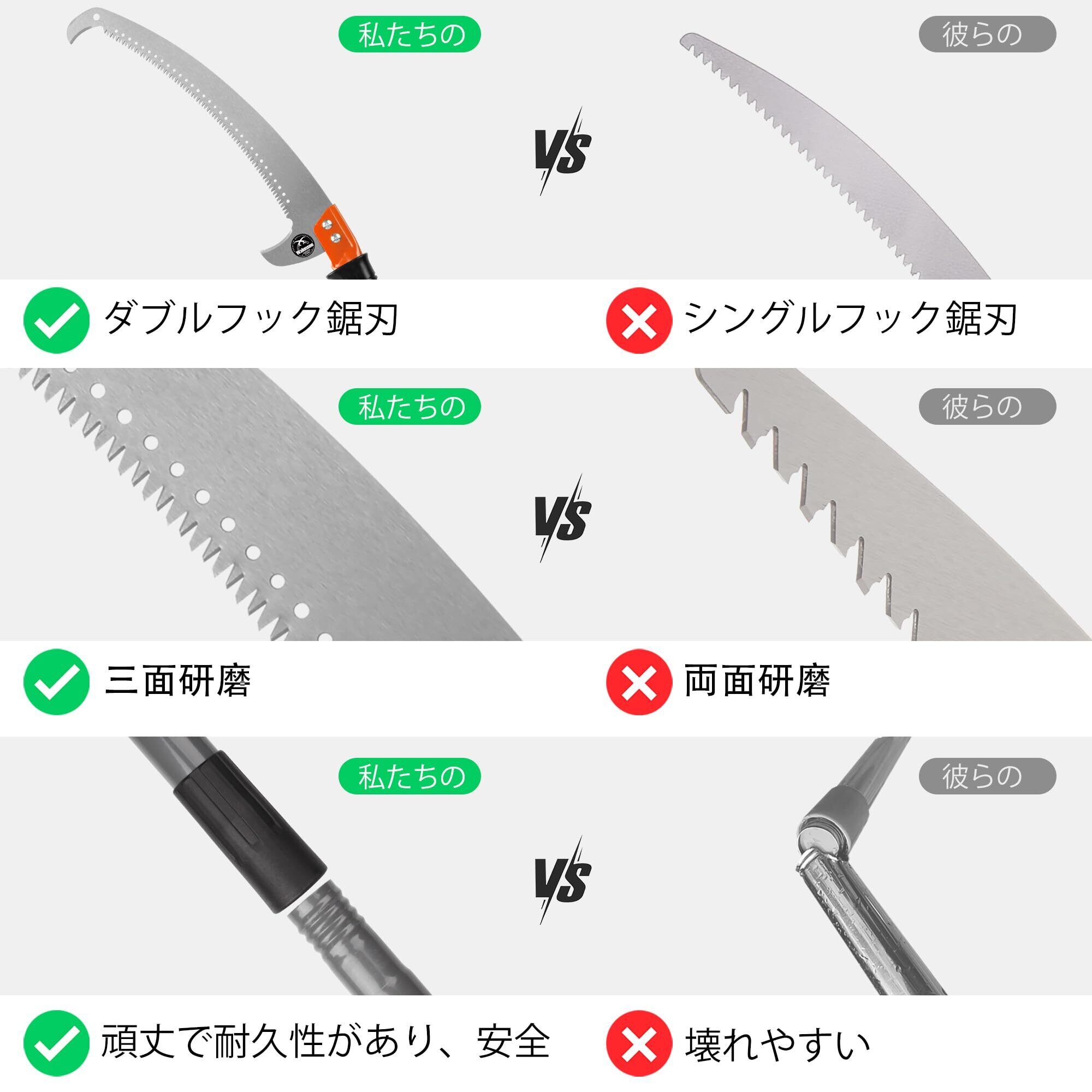 【安全と耐久性のある素材】:ポールは高品質のスチールで作られ、パウダーコートが施されています。また、ノコギリの刃は錆びにくいMn鋼で作られています。滑り止めハンドルグリップは快適で安全です。このポールソーは、梯子に登ることなく、高い位置の枝や葉を剪定するのに十分な強度があります。ハンドルの追加補強ネジにより、ソーヘッドがポールに十分に締まり、落下による危険がありません。