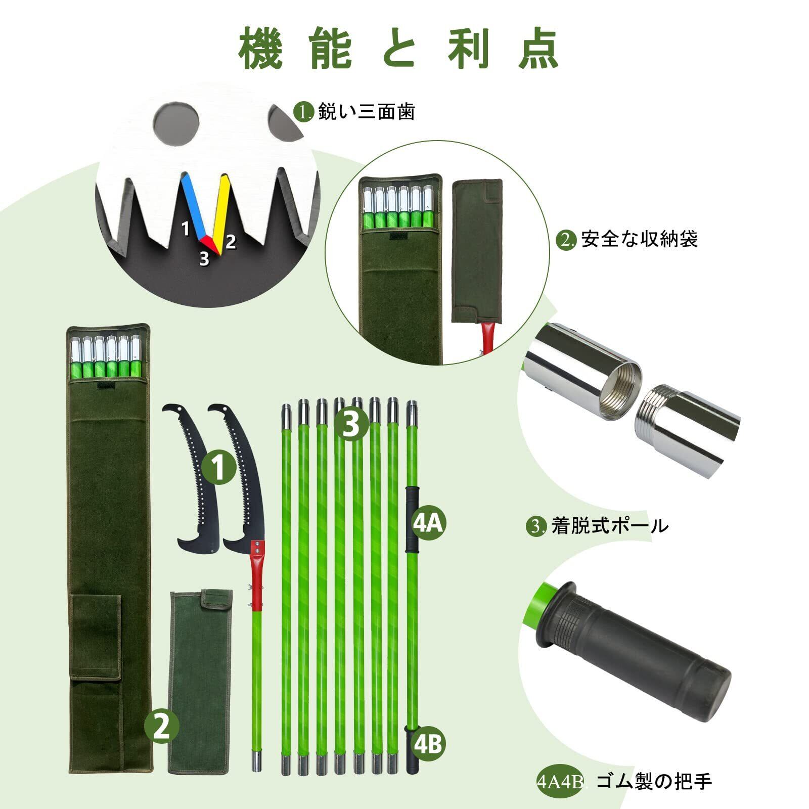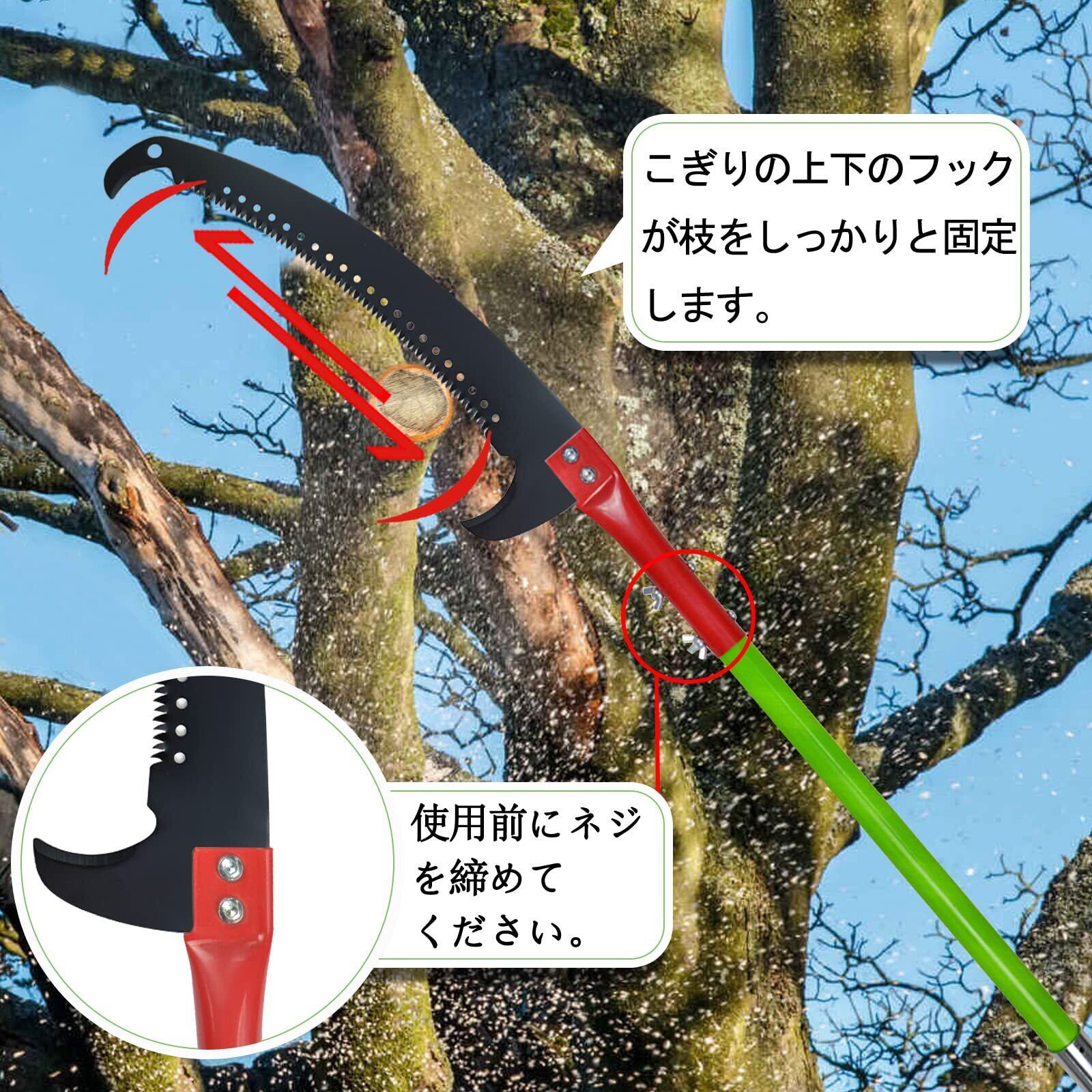 交換用鋸刃と耐久性素材:剪定のこぎりは、8段階のエポキシ樹脂ポールと合金鋼の鋸刃で構成され、軽量で耐久性があります。交換用の追加の鋸刃があります