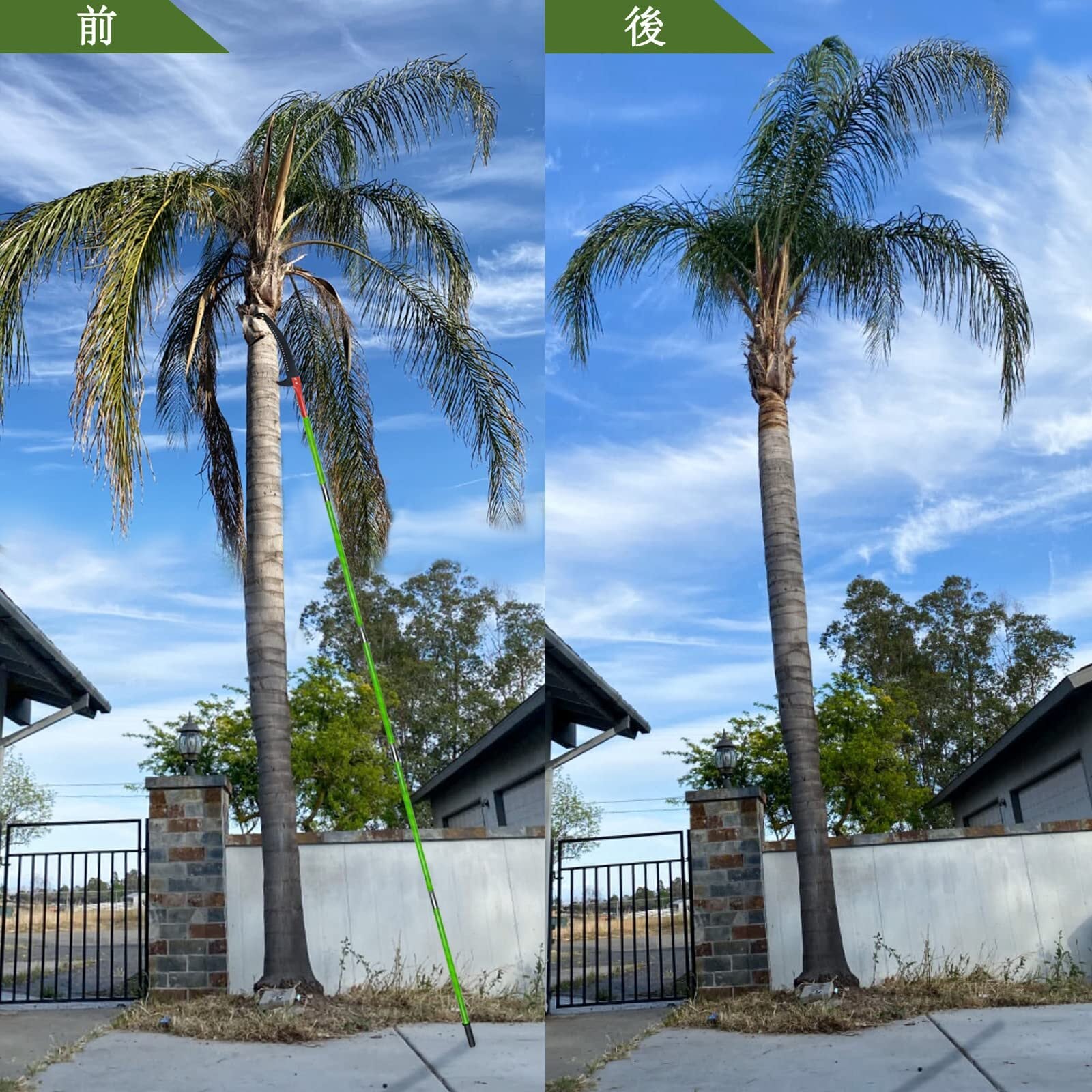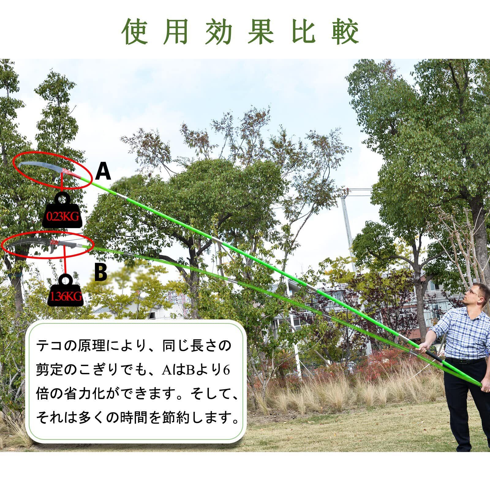 8メートルの枝切りポール:8メートルまで伸びる頑丈なツリートリミングシステムで、高い枝をすばやく簡単に切ることができます。木の高さに合わせてポールの長さを調整できます