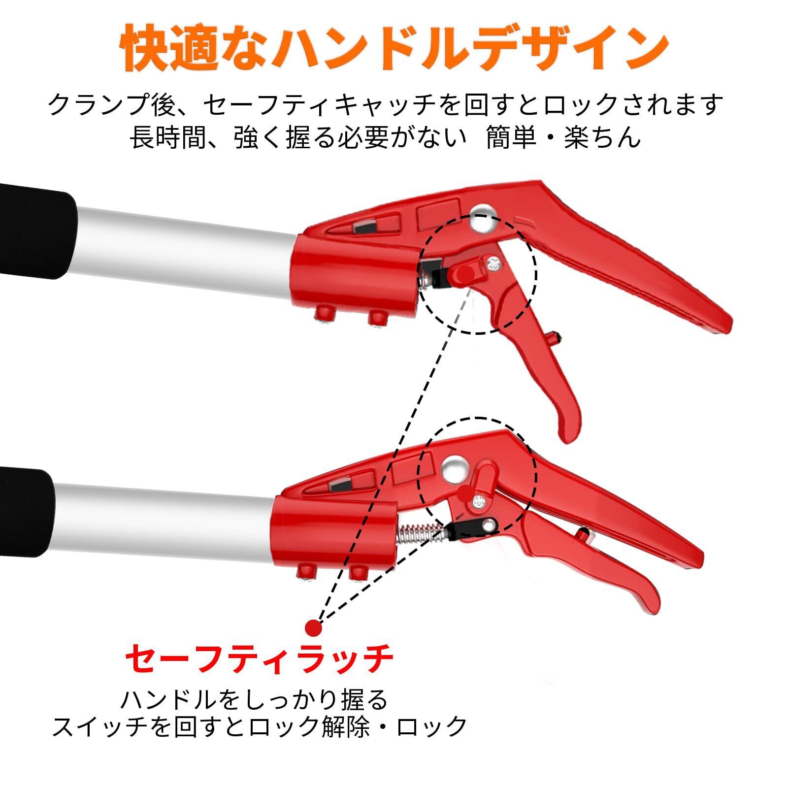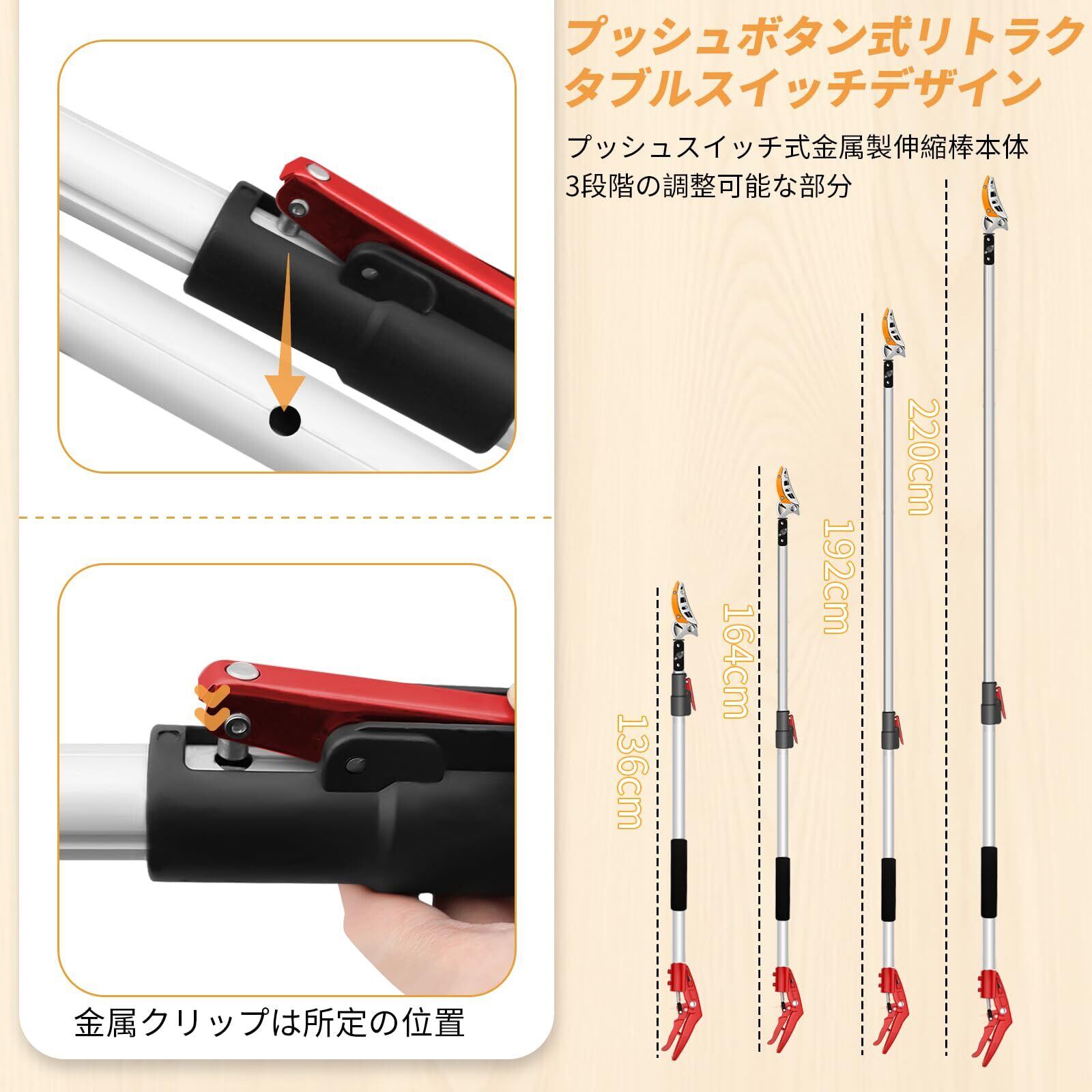 【伸縮可能なグリップ】高枝切鋏のグリップは二段式に伸縮でき、136cm~220cmの範囲で自由に調整できます。高い枝や樹木をカットする場合、階段登りは不要で、安全安心でハサミを使えます。また、調整装置が二つ付きましており、二段式でグリップを自由に伸縮できます。クリップで安全ロックが付き、刃先を閉じることができます。