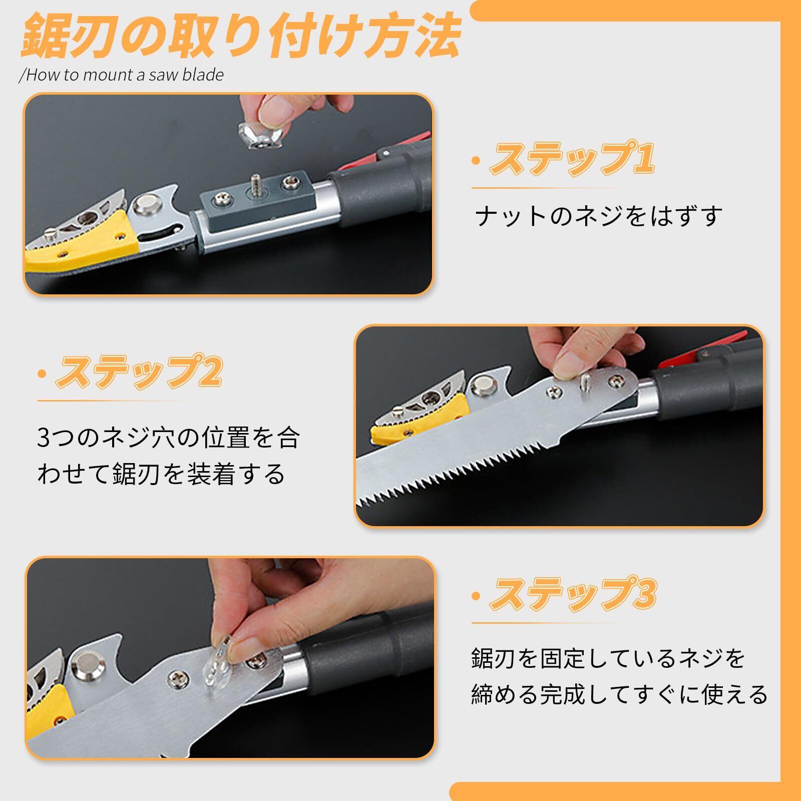 【省力化】高枝切鋏は物理的なてこの原理でドライブし、グリップが長くなるほど、より省力化になります。ABS材質のグリップは握り心地良く、滑り止めも付きでありながら、厚くグリップ設計はお客様の手には優しく、負担をかかりません。三面研磨をしたノコ刃が付属しており、ノコ刃は自由に取り付けや外しが可能です。