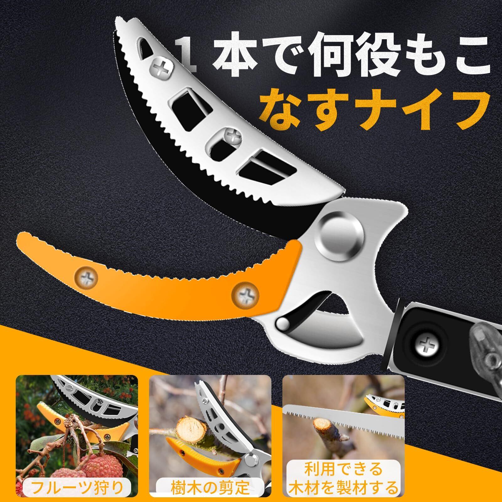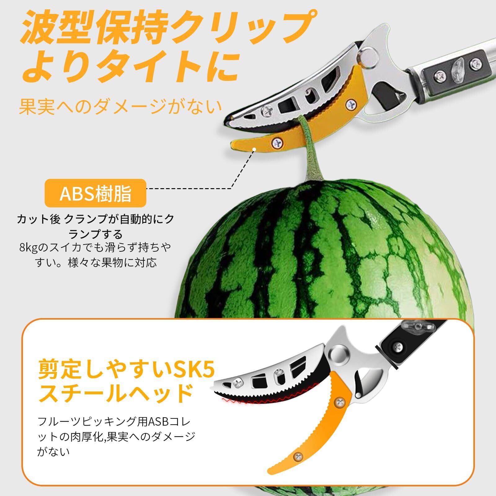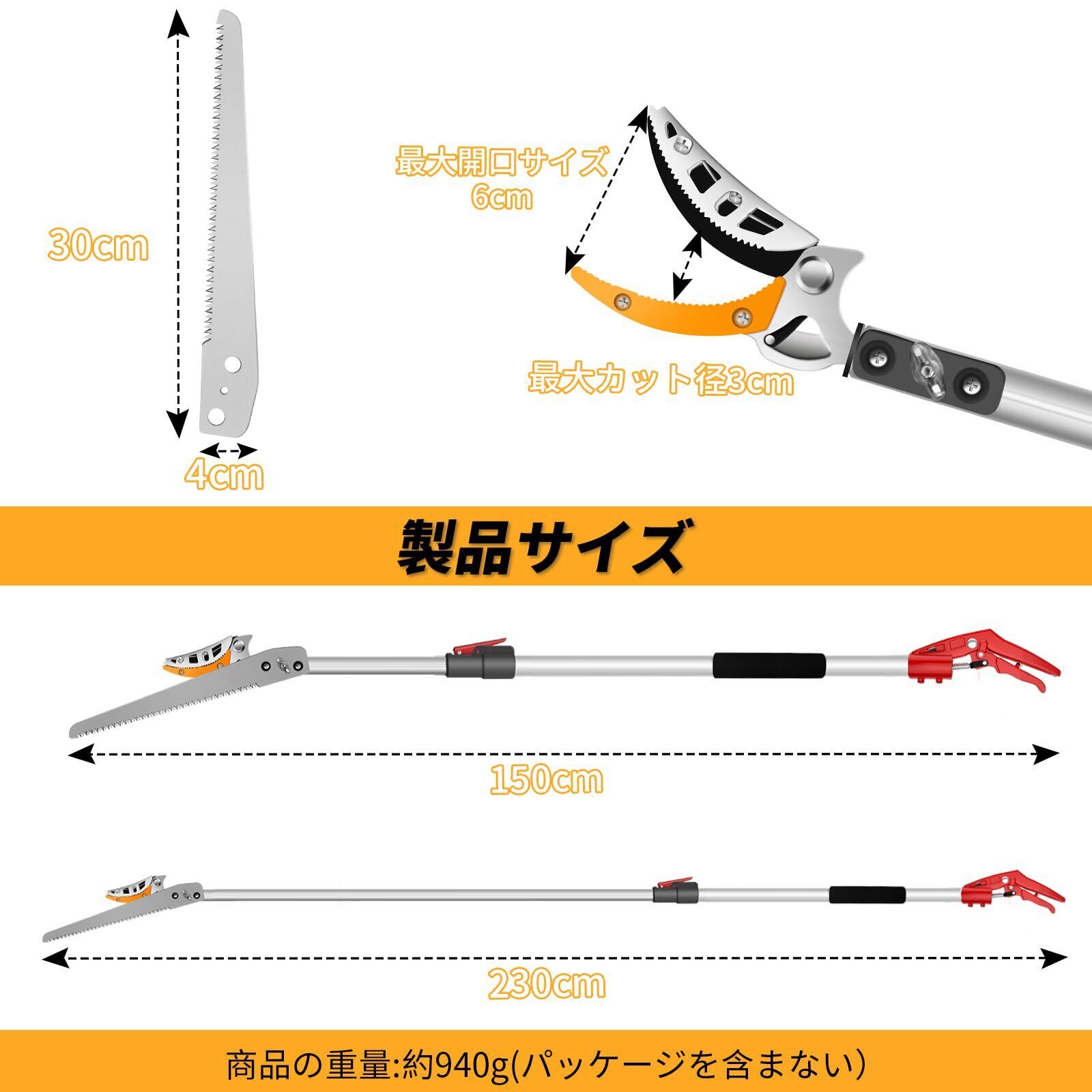 【切れ味抜群】この高枝切鋏のブレードは高精度な研磨が施しされ、鋭くて切れ味抜群です、弧状な刃先デザインはより簡単に太い枝をカットできます、波形固定の模様が設計され、よりしっかりと果物を固定できます。最大開け幅が15mmに達しています。大きい枝や太い枝にも適用、園芸、庭、花園、果樹などにも利用できます。適用シーンは非常に広いです。