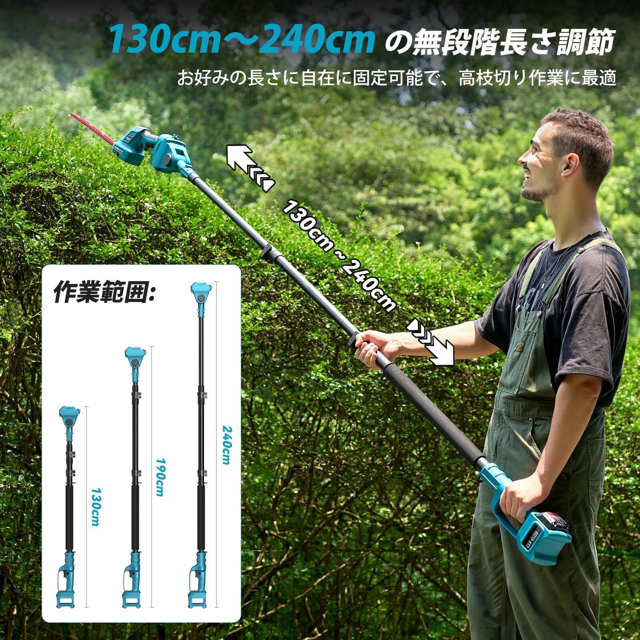 【130cm〜240cmまでの無段階伸縮】本延長ポールは130cmから最大240cmまで無段階に長さ調整が可能で、用途や作業環境に応じてお好みの長さに設定できます。充電式チェーンソーと組み合わせて使用すると、全長は約290cmとなり、高所での剪定作業を安全かつ効率的に行うことができます。回転ロック式ボタンを採用しており、希望の長さにしっかり固定可能です。