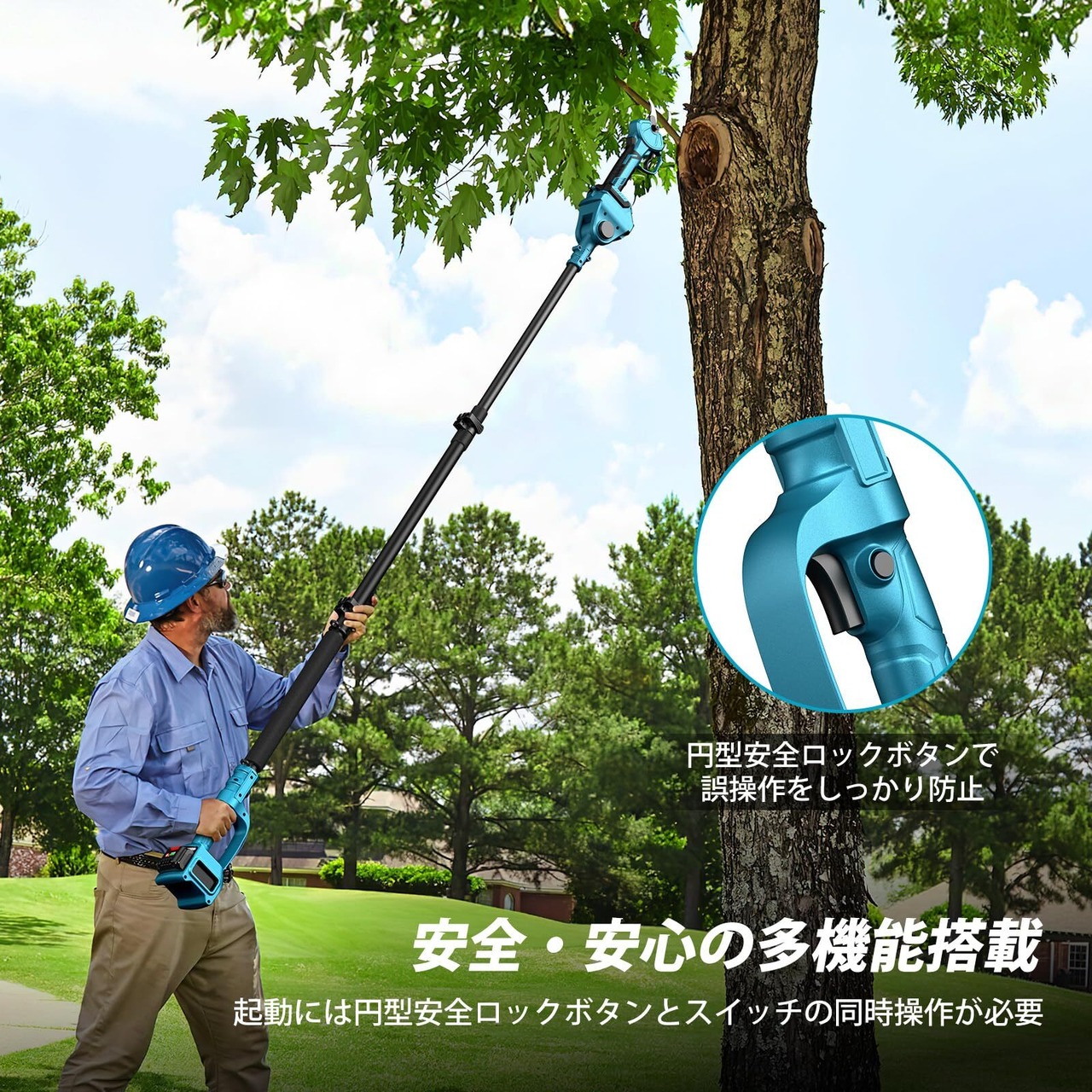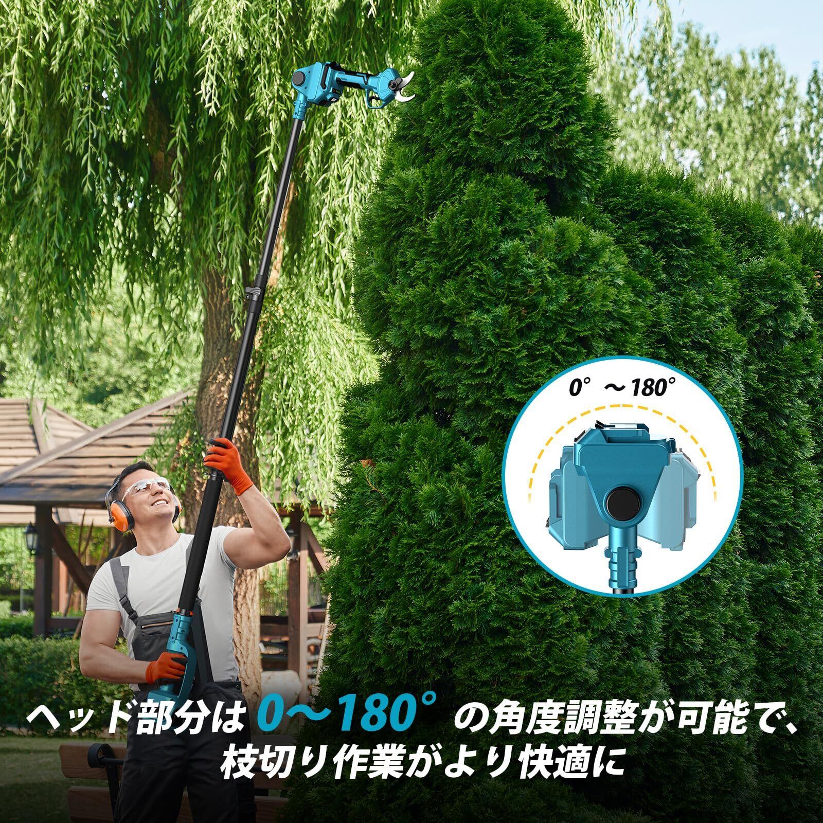 【0~180°の角度調整機能】ポールの先端部分は、ボタンを押すだけで0〜180°の範囲で段階的な角度調整が可能です。これにより、手の届きにくい場所や狭いスペースでもスムーズに剪定が行え、作業効率が飛躍的に向上します。 ※ご注意:1.本製品はマキタ製18Vバッテリー専用です。他社製や異なる電圧のバッテリーには対応しておりません。2.チェーンソーと延長ポールを併用する場合は、延長ポール側の電源スイッチと安全ロックを同時に押すことで作動します。