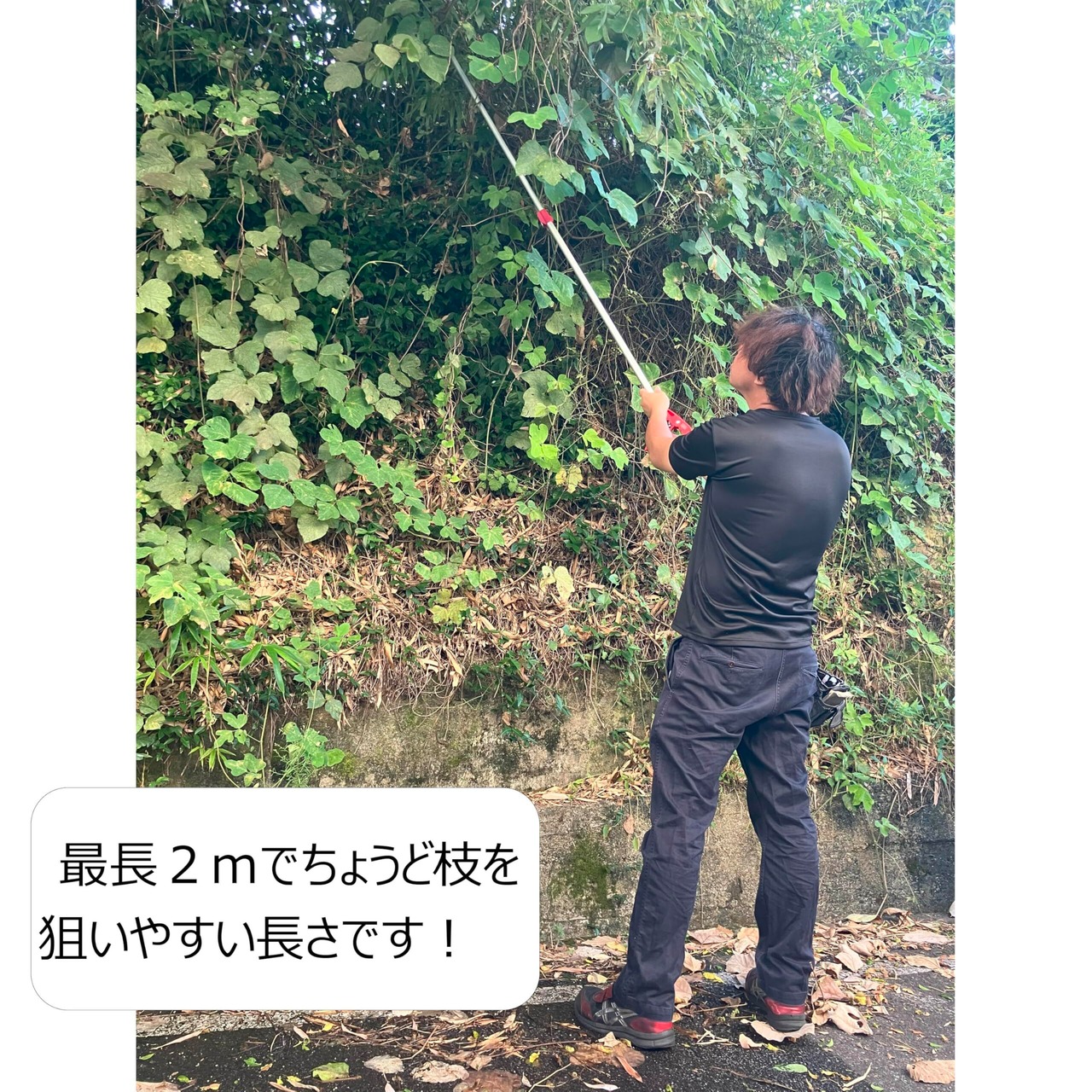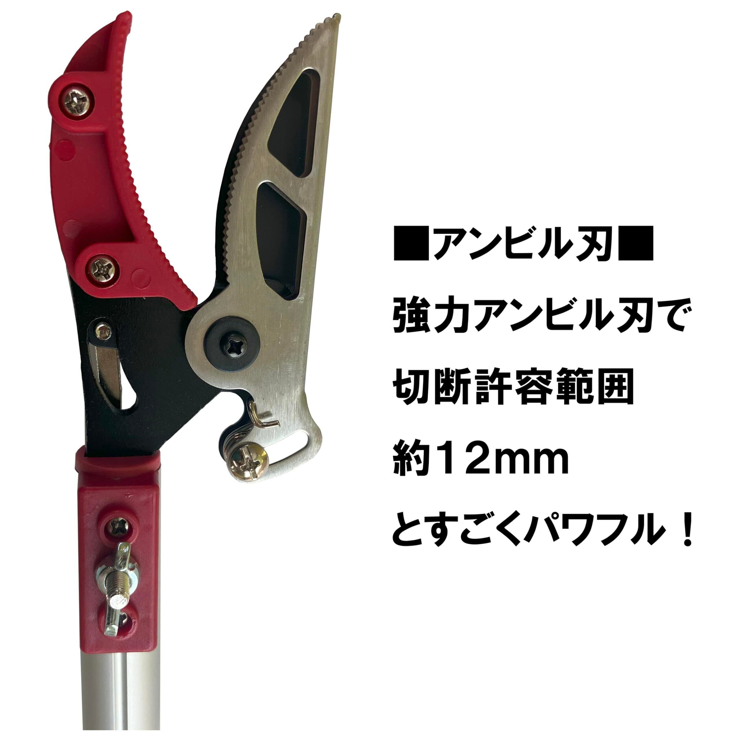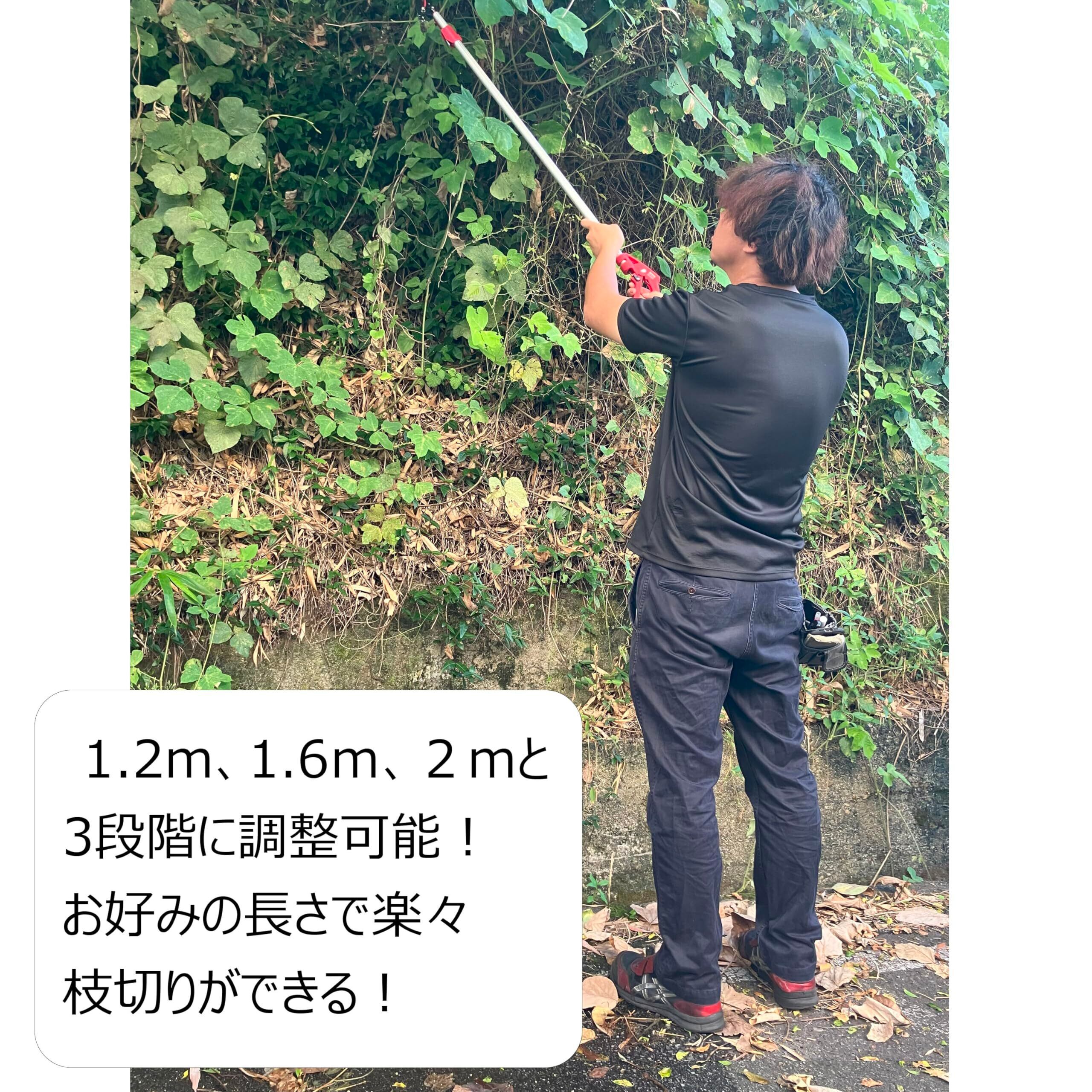 長さ調節レバー:1.2〜2.0mまで伸縮。2mまで伸びるため、およそ 3.5m くらいの高さまでの枝切りが可能です。