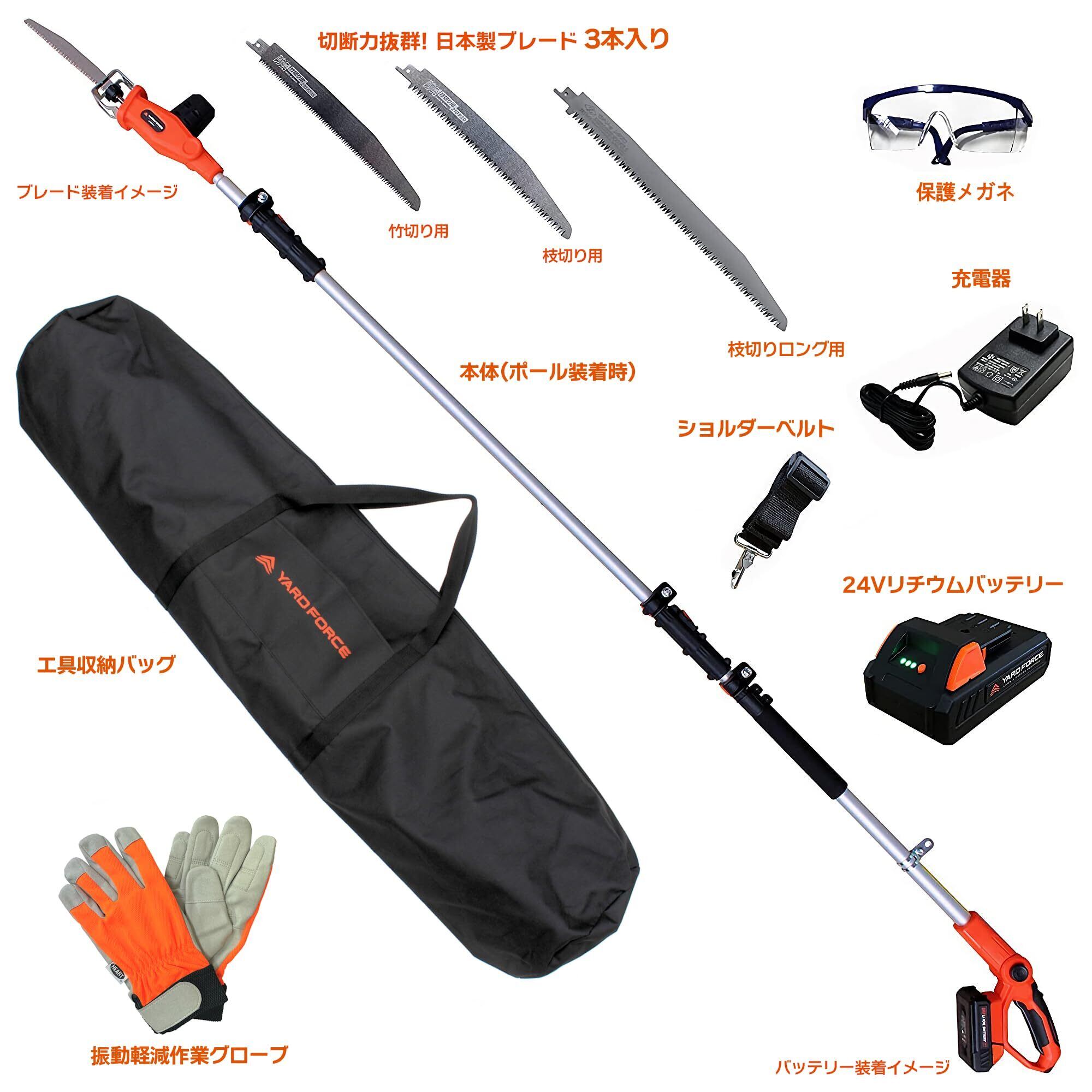 【安心の日本製3種(3本)切れるブレード刃・ YARDFORCE 工具バッグ・他付】 YARD FORCE 24Vコードレス 3m 高枝電動のこぎり ライト「 LS C21P-JP 」24cm径太高枝-15cm径竹高枝切断 +「ブレード刃210-300cm長3種(3本)・ 工具バッグ 他 付」 ヤードフォース 【Prostar/Pack】