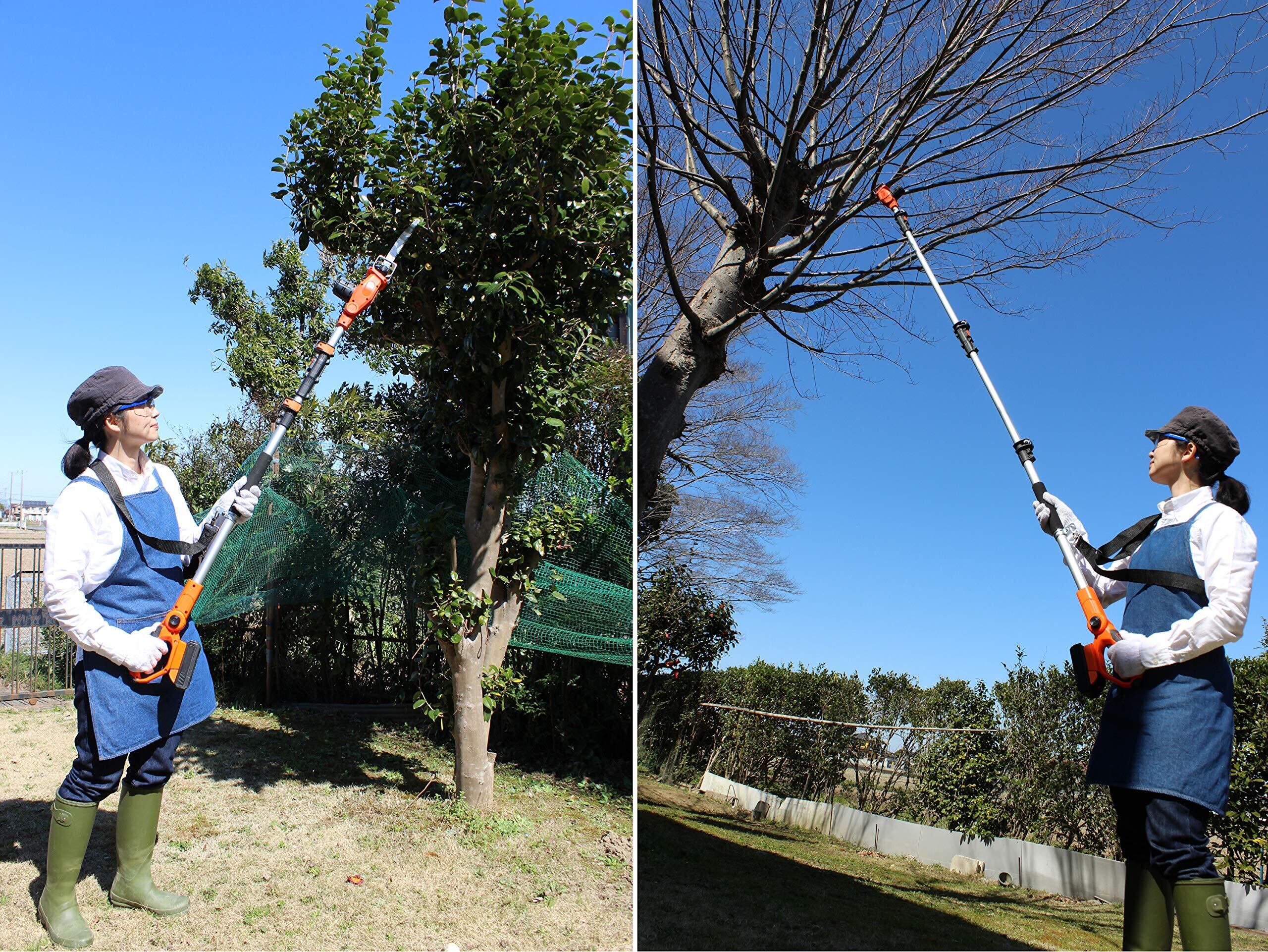 本体機器は、とにかく軽てパワフルストロークで身長合わせ3メートル以上の高枝をもグングン切断していく気持ち良さが更に魅力。
