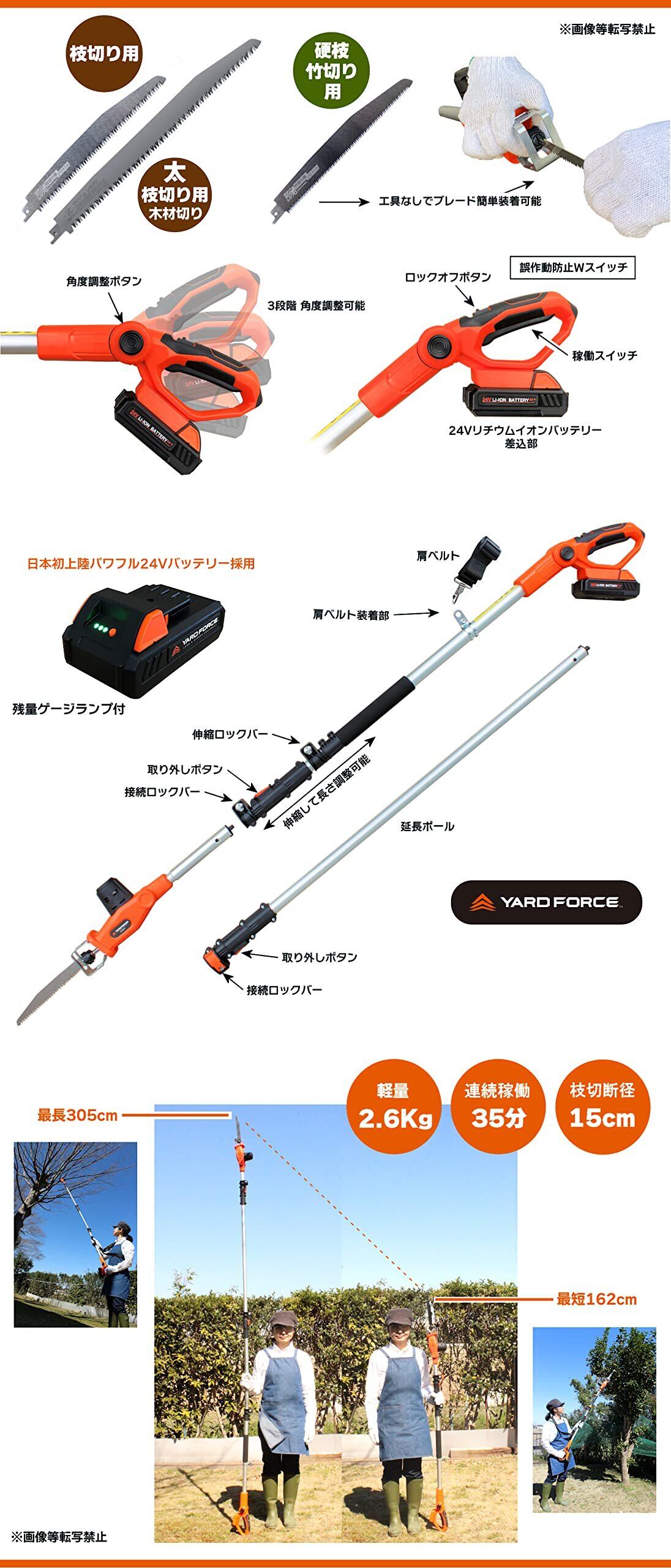 【特価セール】【安心の日本製3種(3本)切れるブレード刃・ YARDFORCE 工具バッグ・他付】 YARD FORCE 24Vコードレス 3m 高枝電動のこぎり ライト「 LS C21P-JP 」24cm径太高枝-15cm径竹高枝切断 +「ブレード刃210-300cm長3種(3本)・ 工具バッグ 他 付」 ヤードフォース 【Prostar/Pack】