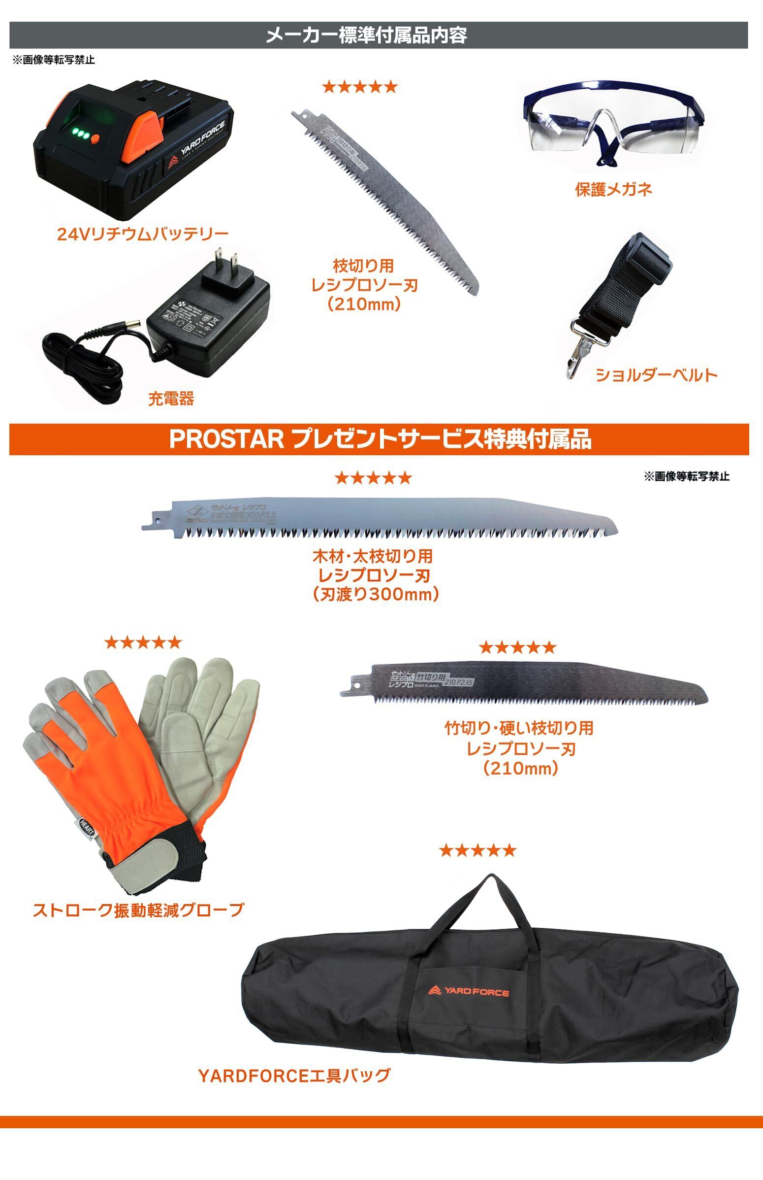 【付属品にいて】●メーカー標準付属品:24Vリチウムイオンバッテリー(残量ケージ付)、充電器、保護メガネ、肩ベルトが標準付属。●その他「あると便利なPROSTARサービス特典付属品(通常同梱されていない特典付属)」が標準付属品以外にサービス同梱されています。サービス品内容:① 日本製竹切り用ブレード刃210mm 約15cm径切断用 ② 日本製木材太枝切り用ブレード300mm 約24cm径切断用 ③ ストローク振動軽減グローブ ④ 持運びや保管に便利なYARDFORCE工具バッグ が同梱された安心サービス特典です。 【ご注意】※必ず、このページ下部に表示されている重要なお知らせや注意事項など最後までお読み頂き、ご理解の上お求めいただきますようお願い申し上ます。
