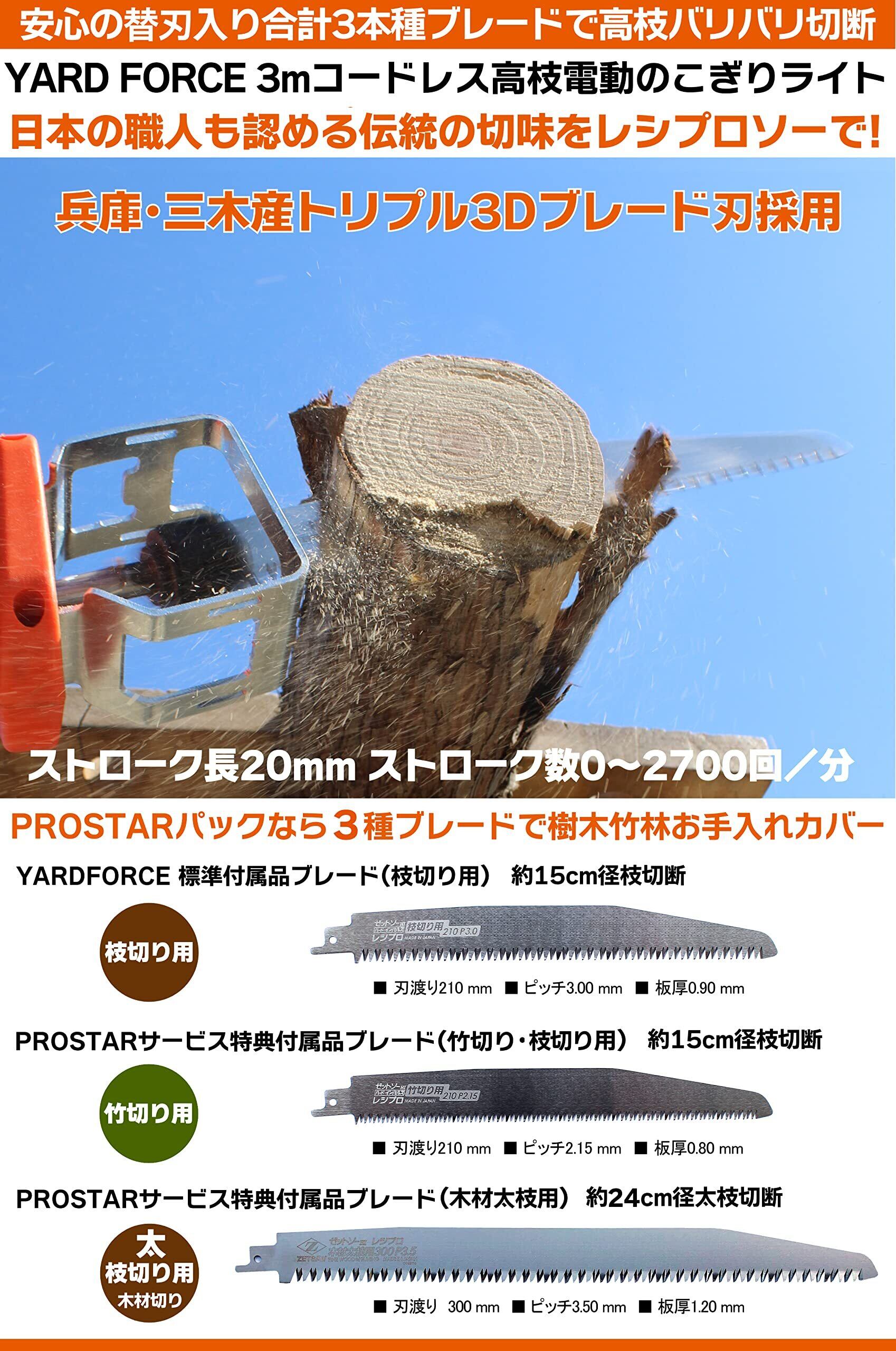【安心のサービス特典3種(3本)切れるブレード刃・YARDFORCE工具収納バッグ・他便利な付属品入りパック】 軽い! 長い! だから作業がラクになって早い!ハイパワー24Vバッテリーの力でパワフルストローク、身長合わせ3メートル以上の高枝もグングン切断していく気持ち良さが更に魅力になったYARDFORCE 3m高枝電動のこぎりライト本体機器に、PROSTARがあると便利な付属品を特別サービス添付しセット商品化したPROSTARオリジナルパック【Prostar/Pack】です。 日本製ブレード刃は合計3種3本同梱されています。