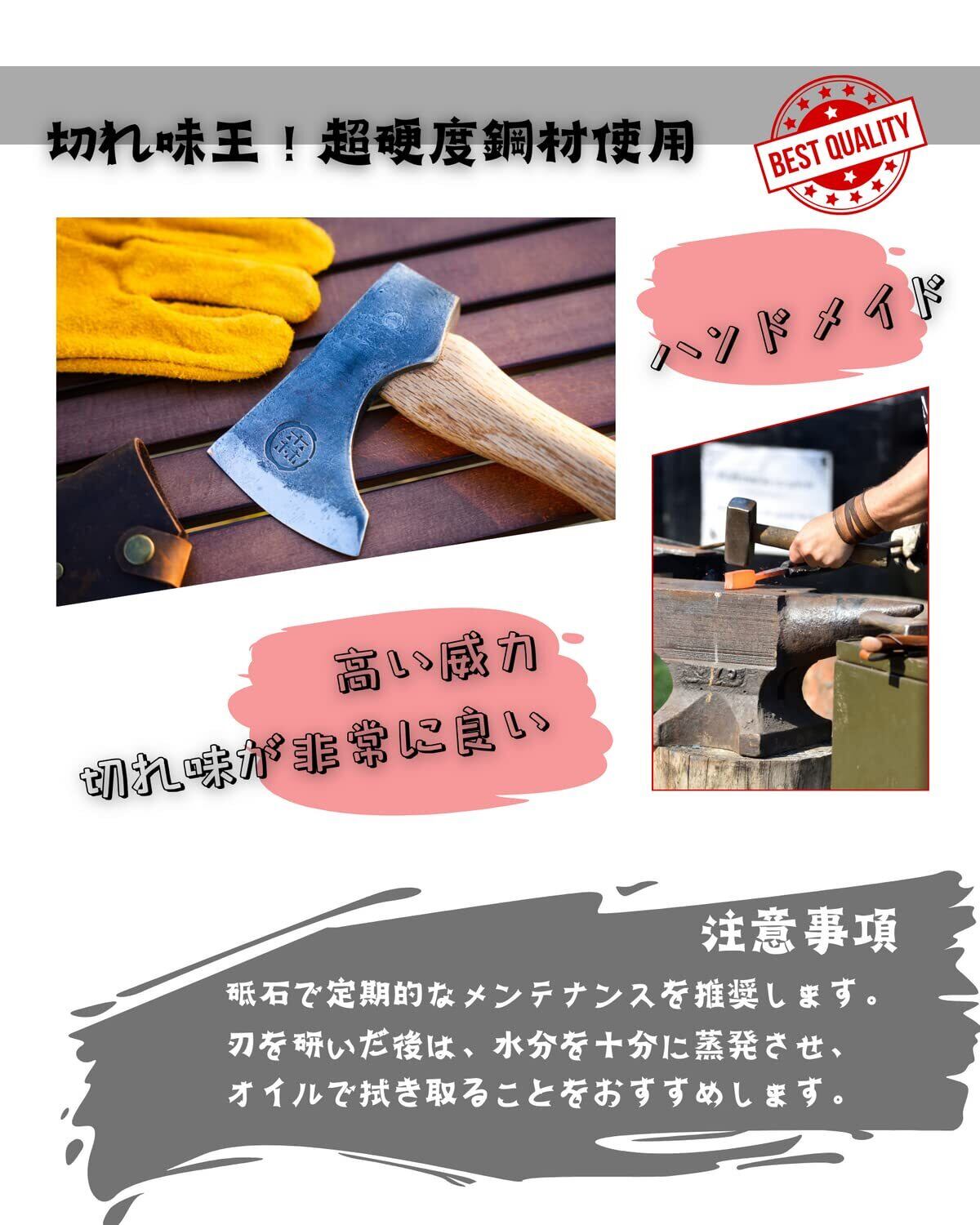 【斧のメンテナンス】斧の刃を研磨し、鋭さを保っています。そのため、損傷を防ぐためにも、硬い物に当てない、特に金属や石のような硬いものに触れると刃が欠けたり、ダメージを受ける可能性があります。金属製品に関してメンテナスが必要です、ご自身で研磨する場合や、水など掃除する場合、しっかり水分を蒸発してから、オイルを拭いてください。