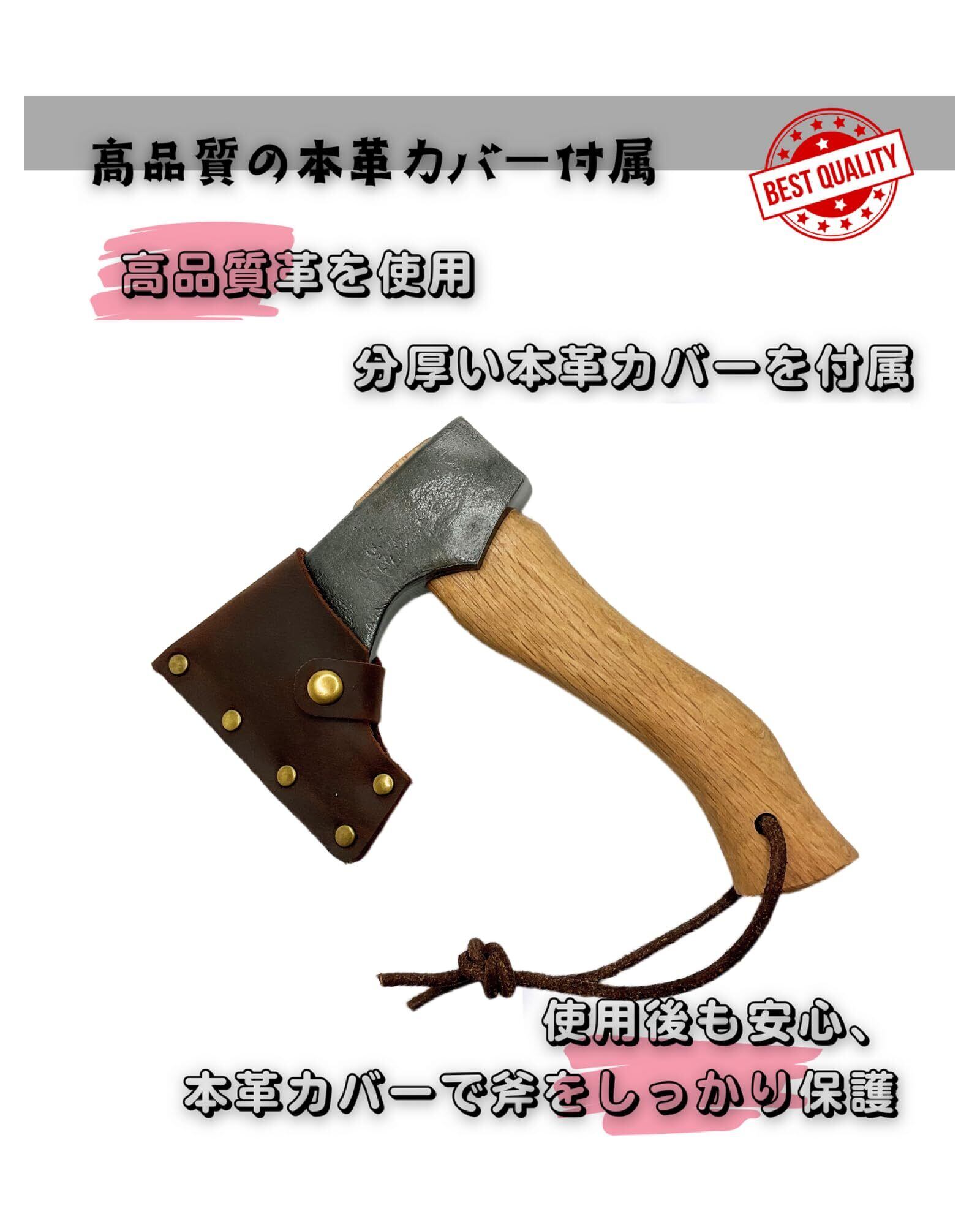 【しっかり保護する本革カバー】ボタンでしっかり留めるタイプで牛首の部分の高品質皮を使用し、分厚い本革カバーを付属しております。使用後、斧の刃をしっか保護してくれます。*運送中安全性のため、刃先にゴムレバーが覆われています。開封ゴムレバーを取って廃棄して結構です。*
