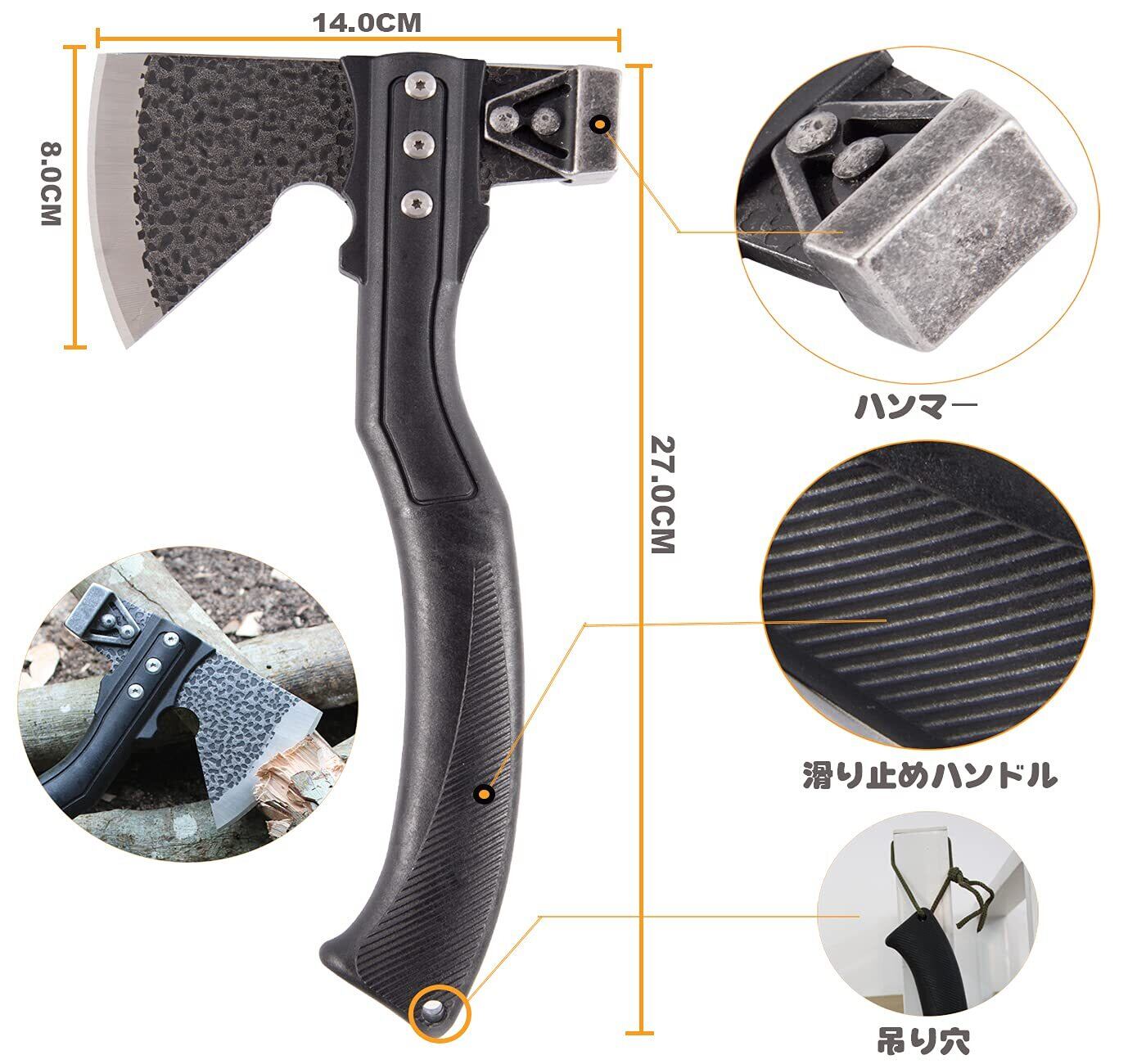 *ハチェット高品質な鋼材をしようした鍛造品で、切れ味の持続と研ぎやすさを兼ね備えています。刃の反対側もハンマーとして使用できます