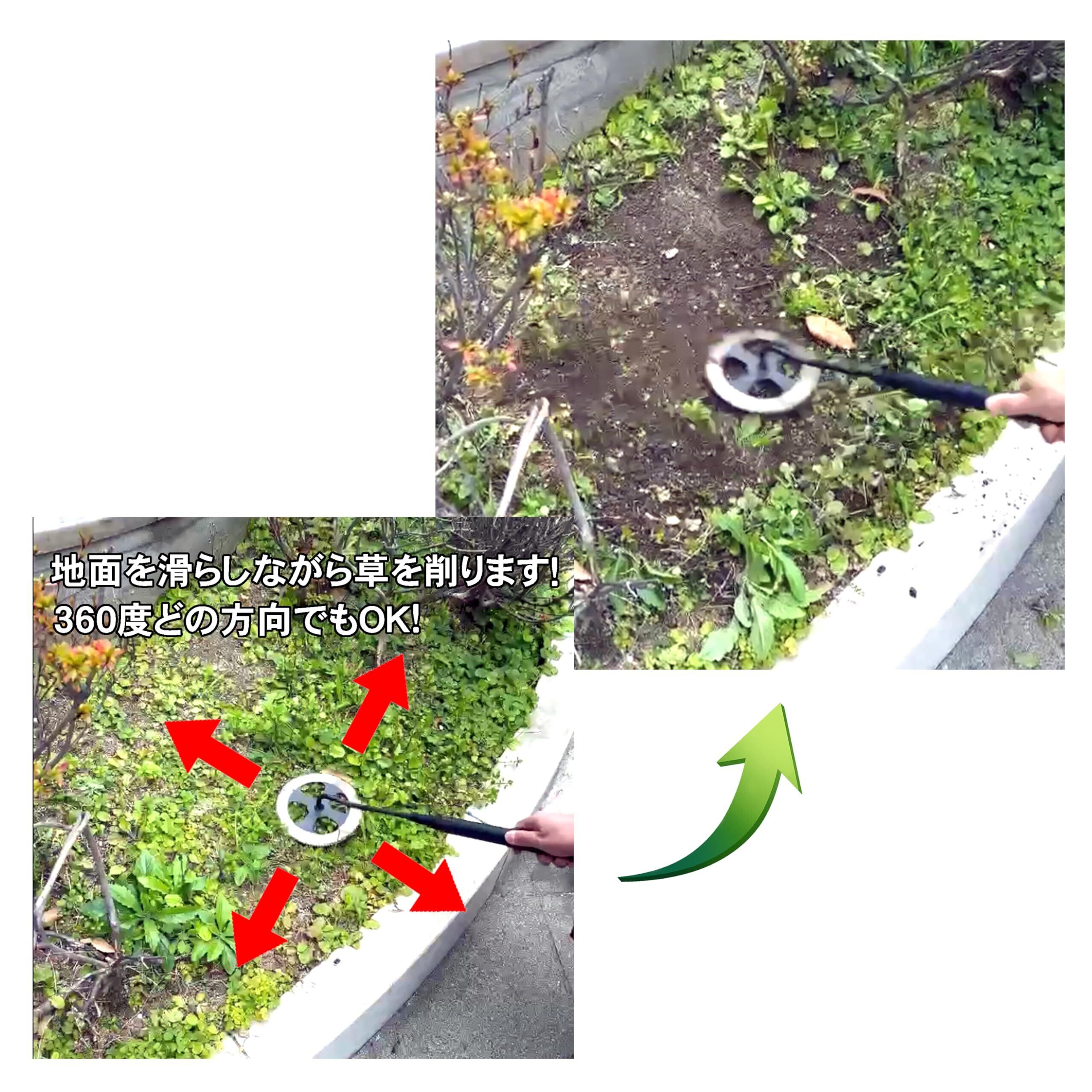 360度どの方向にでも草が削れます。 壁際に生えた雑草も簡単! 地面を滑らしながら草の根を切断し除去します。 ※円盤部(刃部)は固定式で回転致しません。