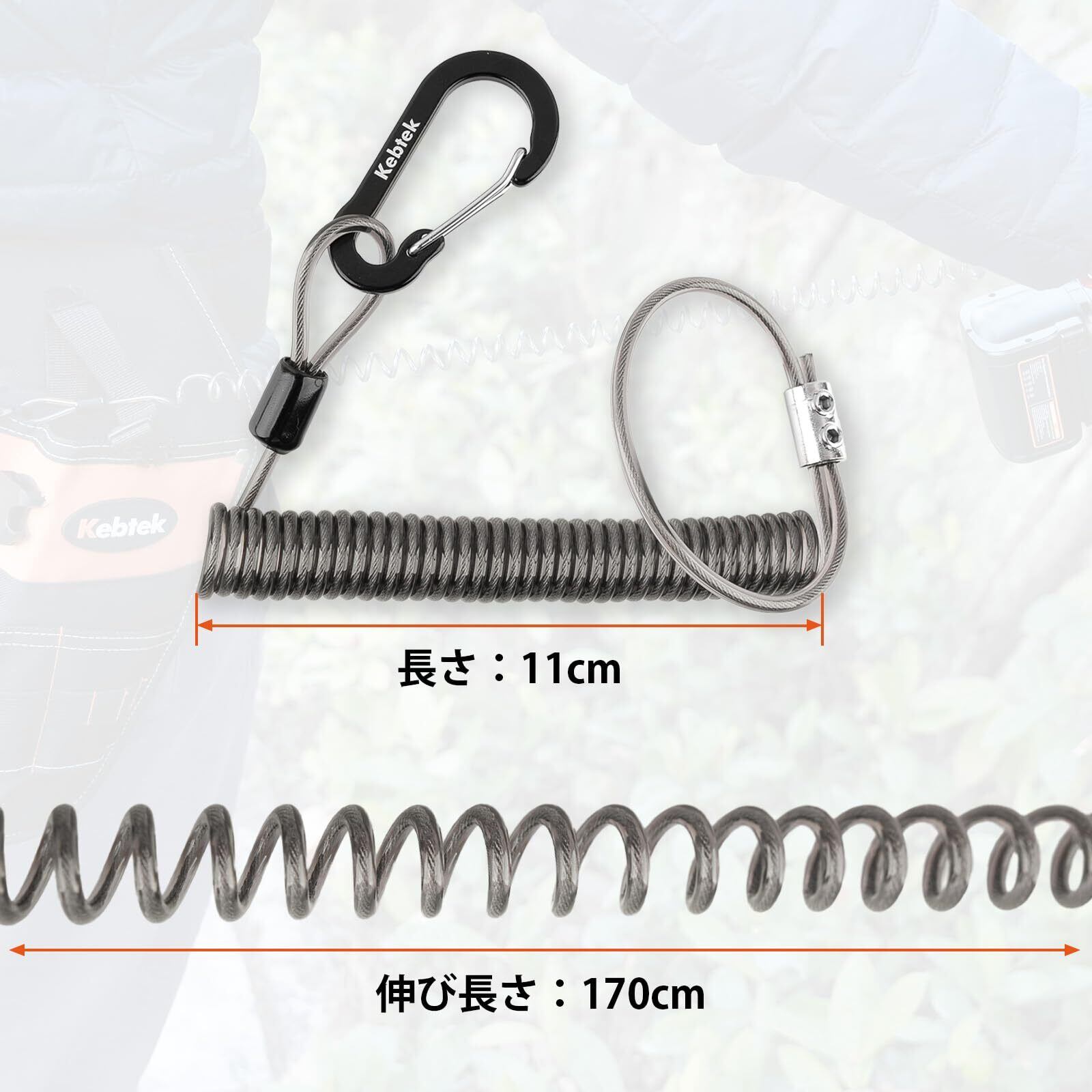 [Kebtek]スパイラルコード ワイヤー内蔵 コイルストラップ 伸び1.7m 耐荷重25kg 落下防止 セーフティコード バンジーコード ランヤード 電動工具掛けケーブル あんぜん対策 アルミニウム製ロック 電気工事 高所安全作業工具