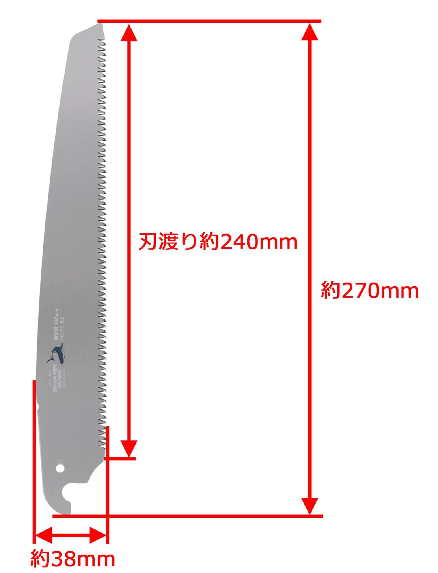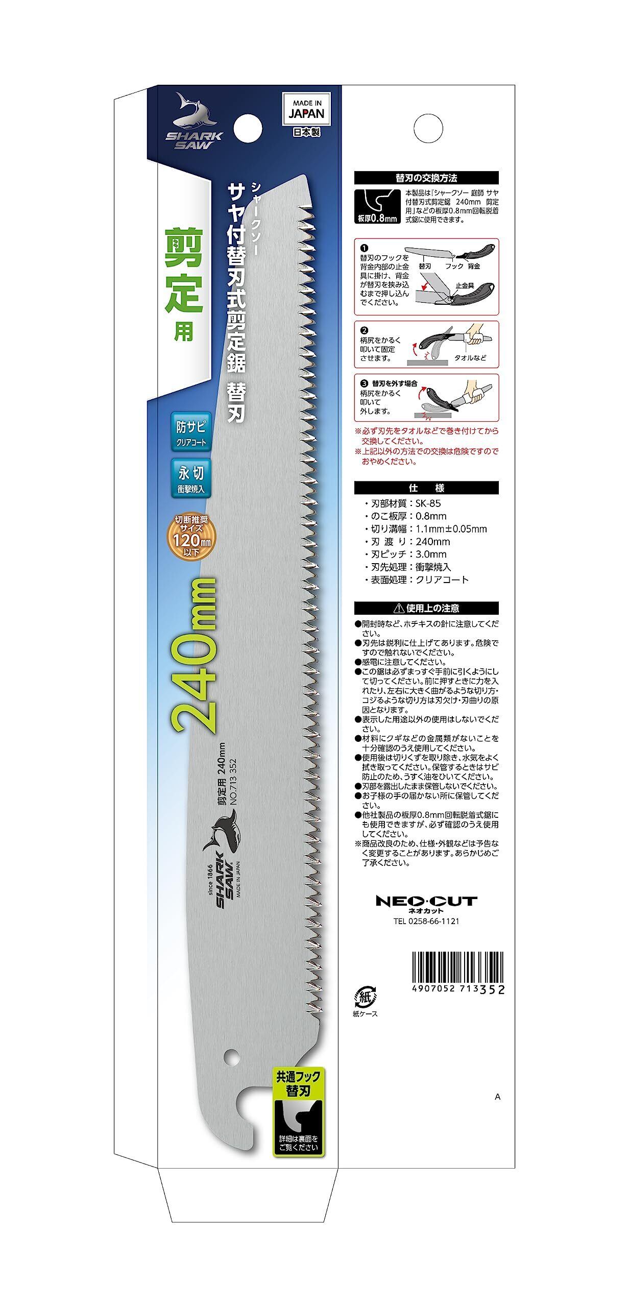 仕様/刃部材質:SK-85、のこ板厚:0.8mm、切り溝幅:1.1mm±0.05mm、刃渡り:240mm、刃ピッチ:3.0mm、刃先処理:衝撃焼入、表面処理:クリアコート、切断推奨サイズ120mm以下