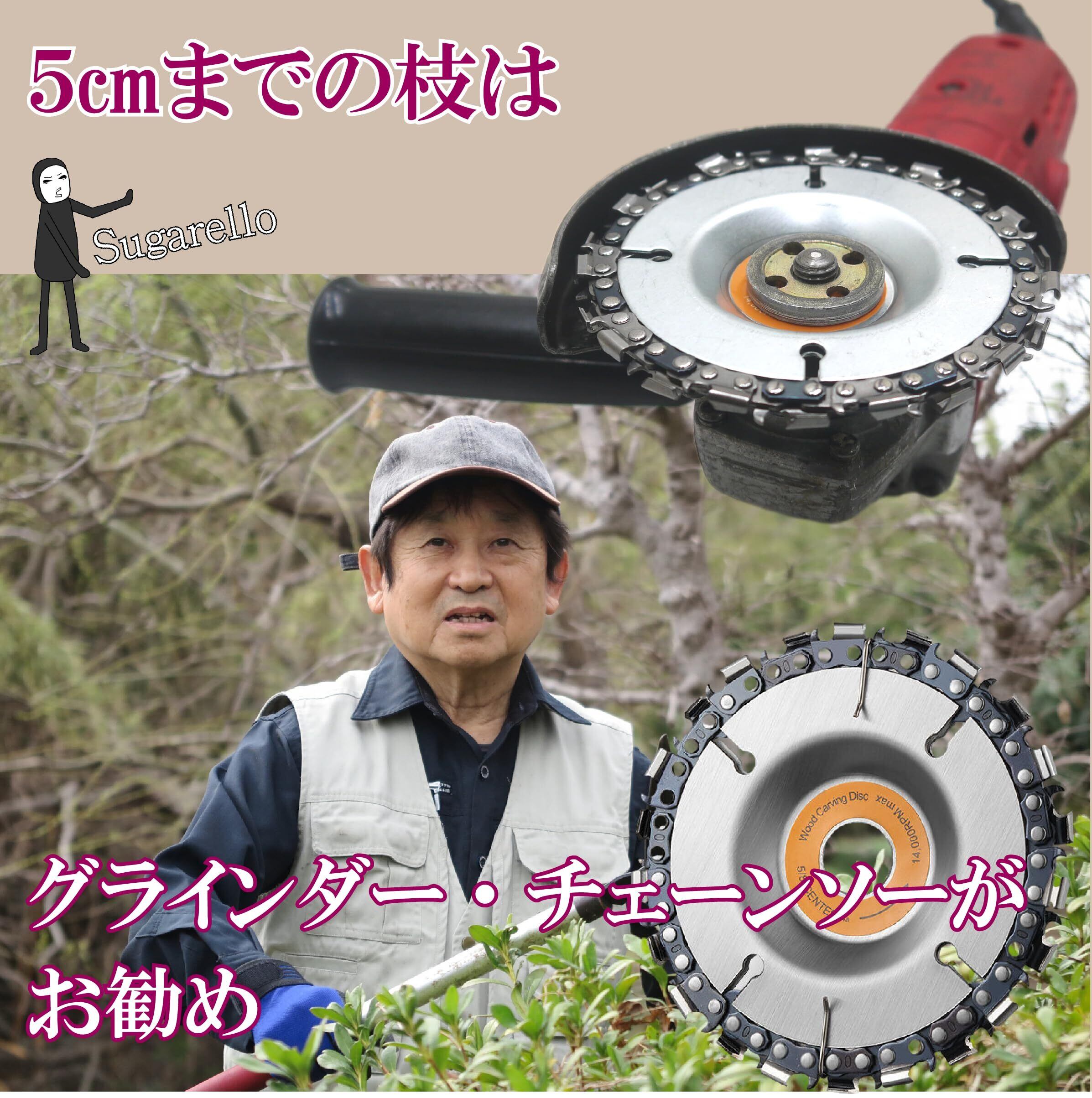 庭木の枝切りにノコギリを使っていますか?手軽に簡単にチェーンソーが使える、グラインダー・チェーンソーがお勧めです。直径100mm、取付穴径16mm、お手持ちのグラインダーがチェーンソーに変わります。