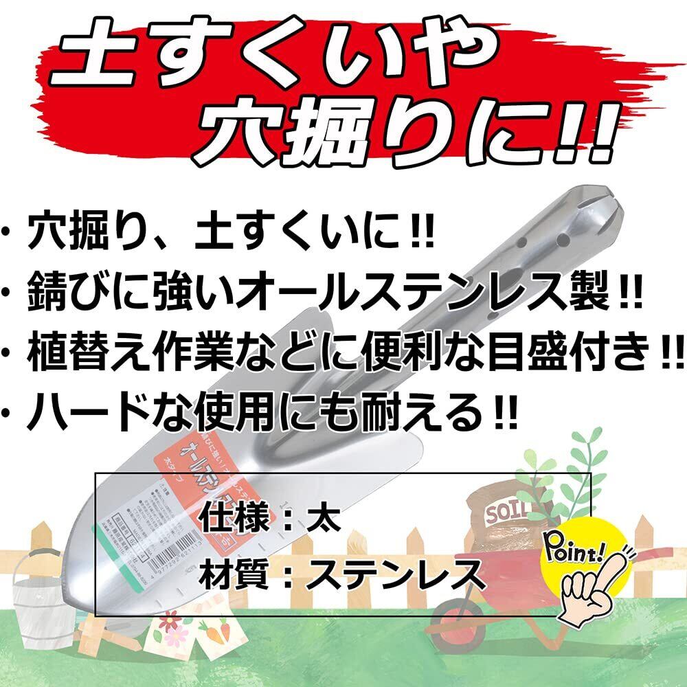 ステンレス製でサビに強く土すくいにも穴掘りにも最適