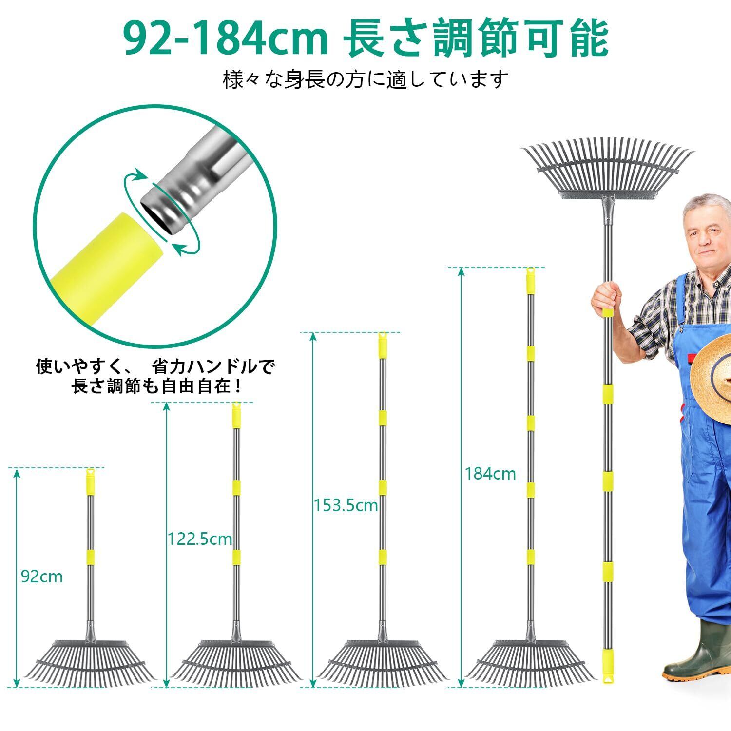 【4段階調節可能ハンドル】ガーデン熊手レーキのハンドルが伸縮式でご利用の都合でハンドルの長さを自由に調節可能です。熊手の全長は92-184cmの間で調節することができ、腰を曲げずに効果的に落ち葉を集めることができ、異なる身長のユーザーに適しています。滑り止めハンドルは人間工学に基づいて設計され、安全で滑り止めです。庭仕事が楽になる、大人も子供も;一緒に庭掃除をして、楽しい家族の時間を過ごしましょう。