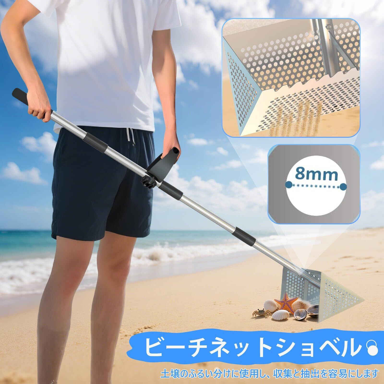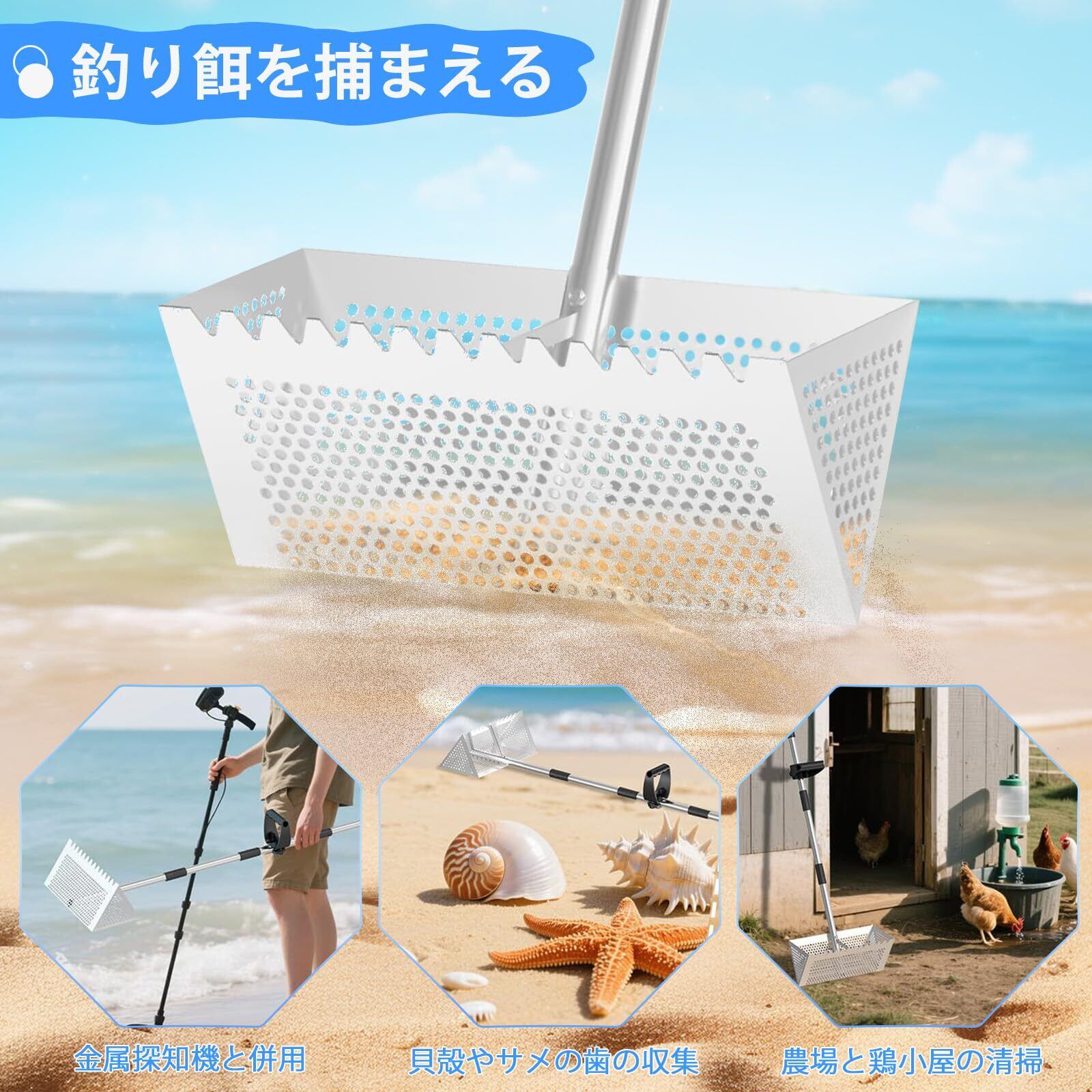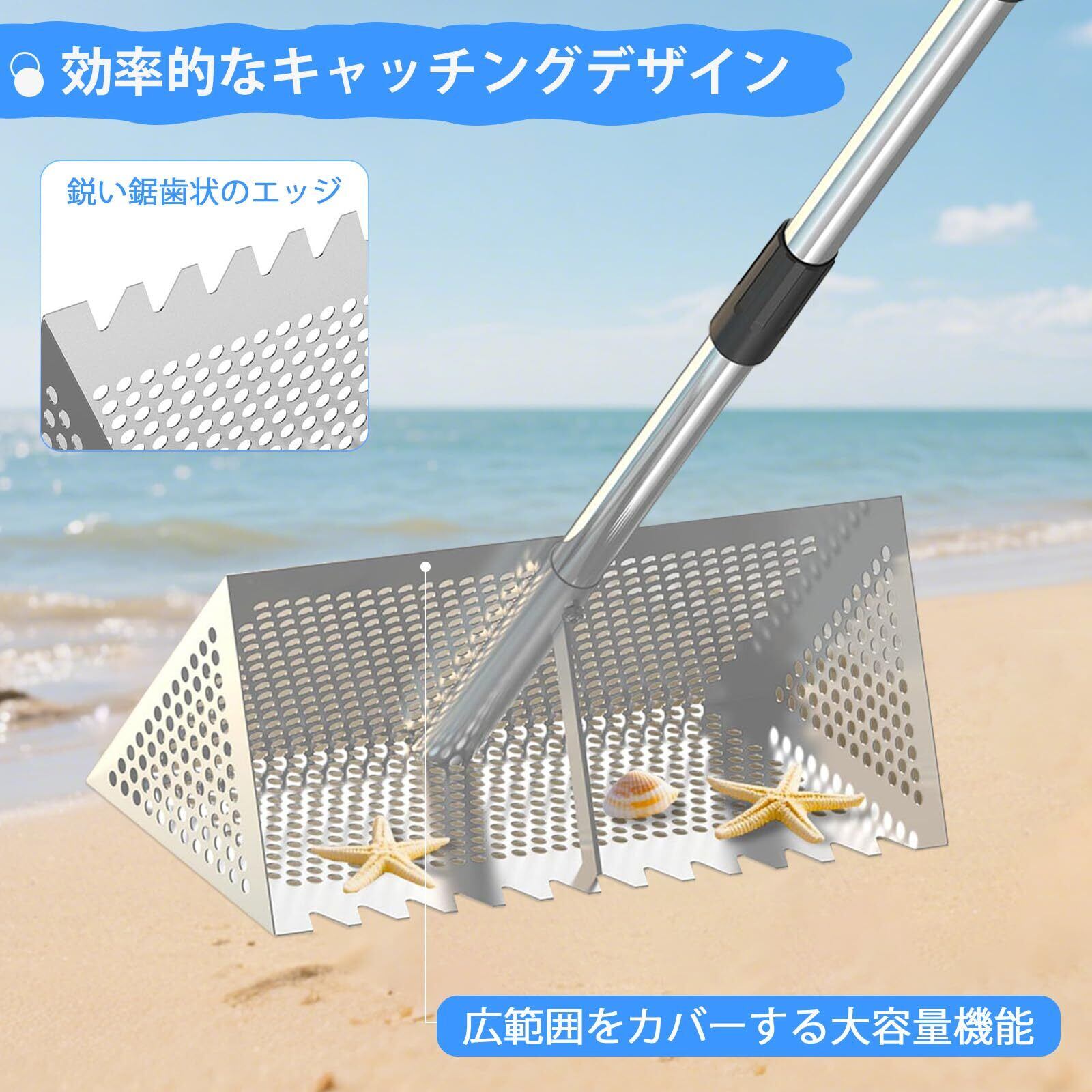 【多機能設計】砂シャベル、砂ふるい、サメの歯ふるいを一体化し、お客様のさまざまなニーズに満足できます。砂を掘ったり、貝殻をふるいにかけたりする場合に、このツールがあれば作業/遊びが楽になります。プロの漁業者にとっても欠かせないツールです。